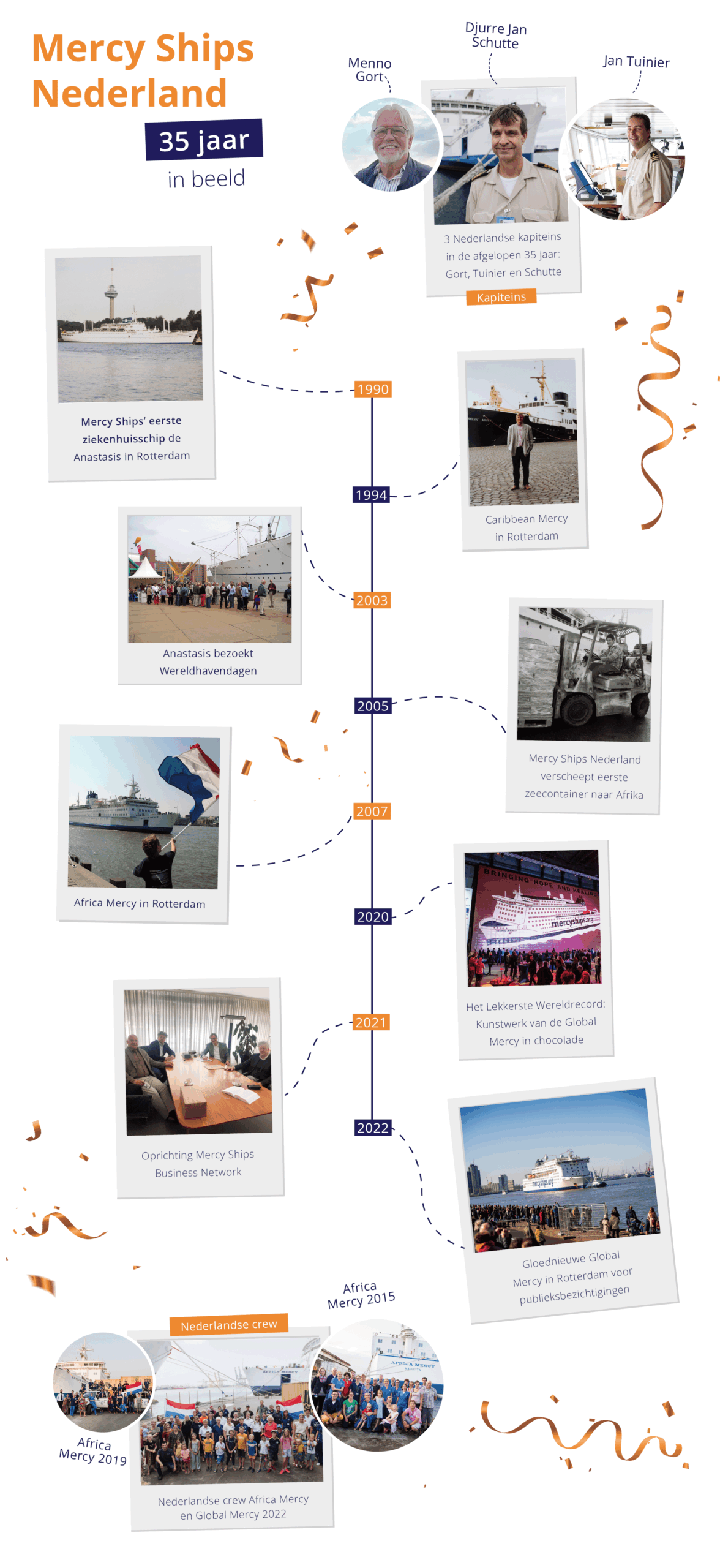 Sinds de oprichting in 1990 heeft Mercy Ships Nederland een prachtige reis afgelegd. Wat begon met een kleine groep vrijwilligers die een bezoek van de Anastasis (het eerste schip van Mercy Ships) aan Rotterdam voorbereidden, is in 35 jaar uitgegroeid tot een bloeiende organisatie met tientallen medewerkers en honderden toegewijde vrijwilligers. Vele redenen om dankbaar te zijn!