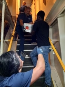 Een oproep doen voor een menselijke keten om alles vlot aan boord te krijgen!