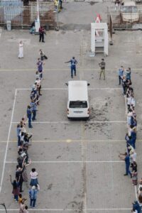 Crew waving goodbye to the last patient of the Sierra Leone field service during their discharge.
