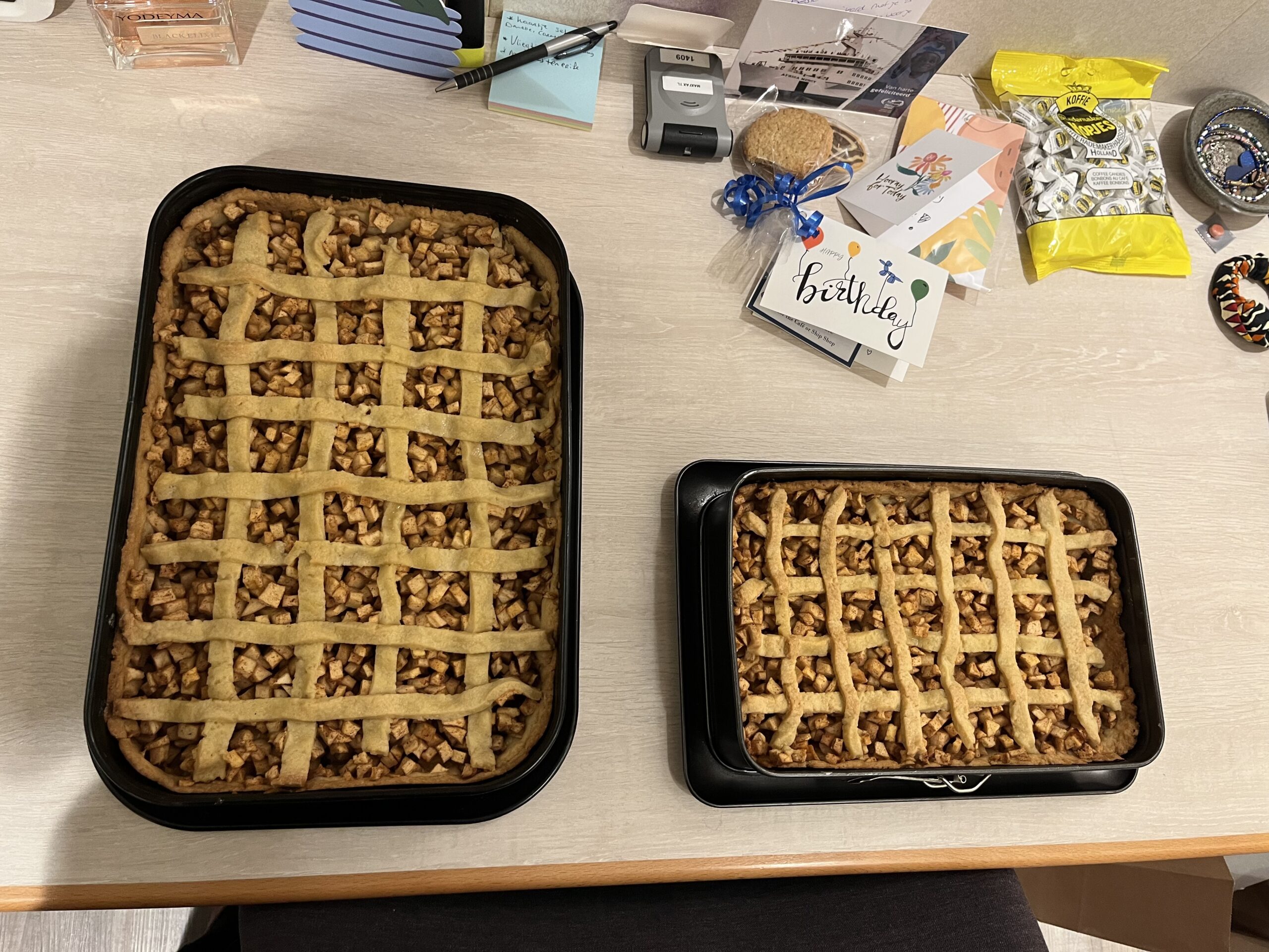 Het schip is ook een plek waar feest wordt gevierd. Hoe bijzonder, dat dit jaar mijn verjaardag als een echte shipbirthday gevierd mocht worden. Het begon allemaal met de voorbereidingen en het bakken van echte Nederlandse appeltaart, voor het eerst from scratch en niet uit een pakje! Op de dag zelf werd ik wakker met veel slingers en ballonnen aan de buitenkant van m’n cabin. Snel nog eventjes een wasje gedraaid, want tja, dat moet ook gebeuren en dan op naar de koffie! Het is ongelooflijk wat voor een hechte vriendschappen je in korte tijd opbouwt. Een dag vol liefde/waardering, felicitaties, spelletjes, taart en vrienden.. En wat een stapel kaarten en berichtjes heb ik mogen ontvangen vanuit Nederland, middels dit bericht: Ontzettend bedankt allemaal! Tienduizend redenen tot dankbaarheid en een verjaardag om nooit te vergeten!