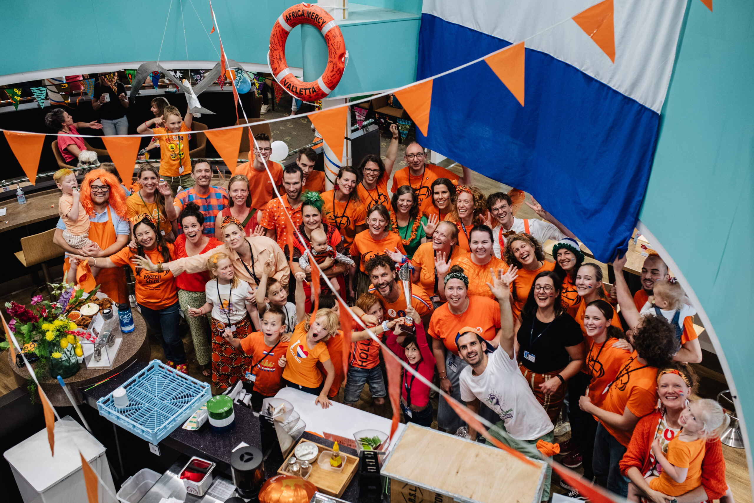 En, dan nog een feestje! Koningsdag!! En niet alleen koninsdag, want het was ook nog eens Sierra Leone Independence Day: dubbel feest. Nederlands, of niet.. er is geen excuus nodig om het hele schip oranje te maken. Het was een dag vol oud-hollandse spelletjes: zaklopen, spijkerpoepen, ezeltje-prikje, spijkerbroek hangen, noem het maar op. Helaas waren waren de bitterballen nog ergens onderweg in een container, maar de bakker aan boord had speciaal oranje-tompoucen gemaakt. Oja, en met spelelementen heb je natuurlijk ook winnaars.. Met trots kan ik mededelen dat ons groepje een 3e plek heeft weten te bemachtigen, en wat is nu mooier dan zelfs je vrienden ‘oranje’ te maken.