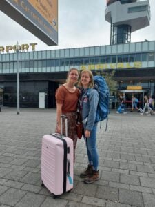 Na wat wikken en wegen had ik toch besloten om tien kilo extra bij te boeken, en dus ging ik ‘s ochtends met twee koffers, een backpack, een fotocameratas en schoudertas richting Rotterdam Airport. Voordat het zover was, zetten mijn ouders en zusje mij eerst af bij de supermarkt waar mijn broertje werkt, omdat hij geen afscheid had kunnen nemen die avond daarvoor. Ik liep daarom met mijn ‘Mercy Ships Crew Shirt’ en bergschoenen door het winkelcentrum, op zoek naar een lange gozer van bijna twee meter. Toen ik hem vond, kreeg ik gelukkig een kleine ‘hug’. Nu kon ik echt richting het vliegveld.