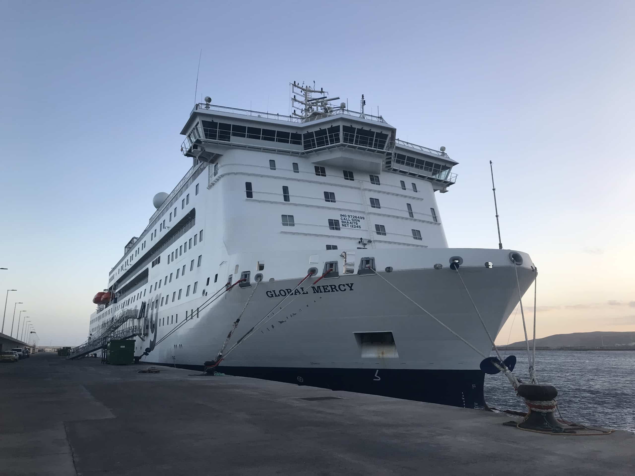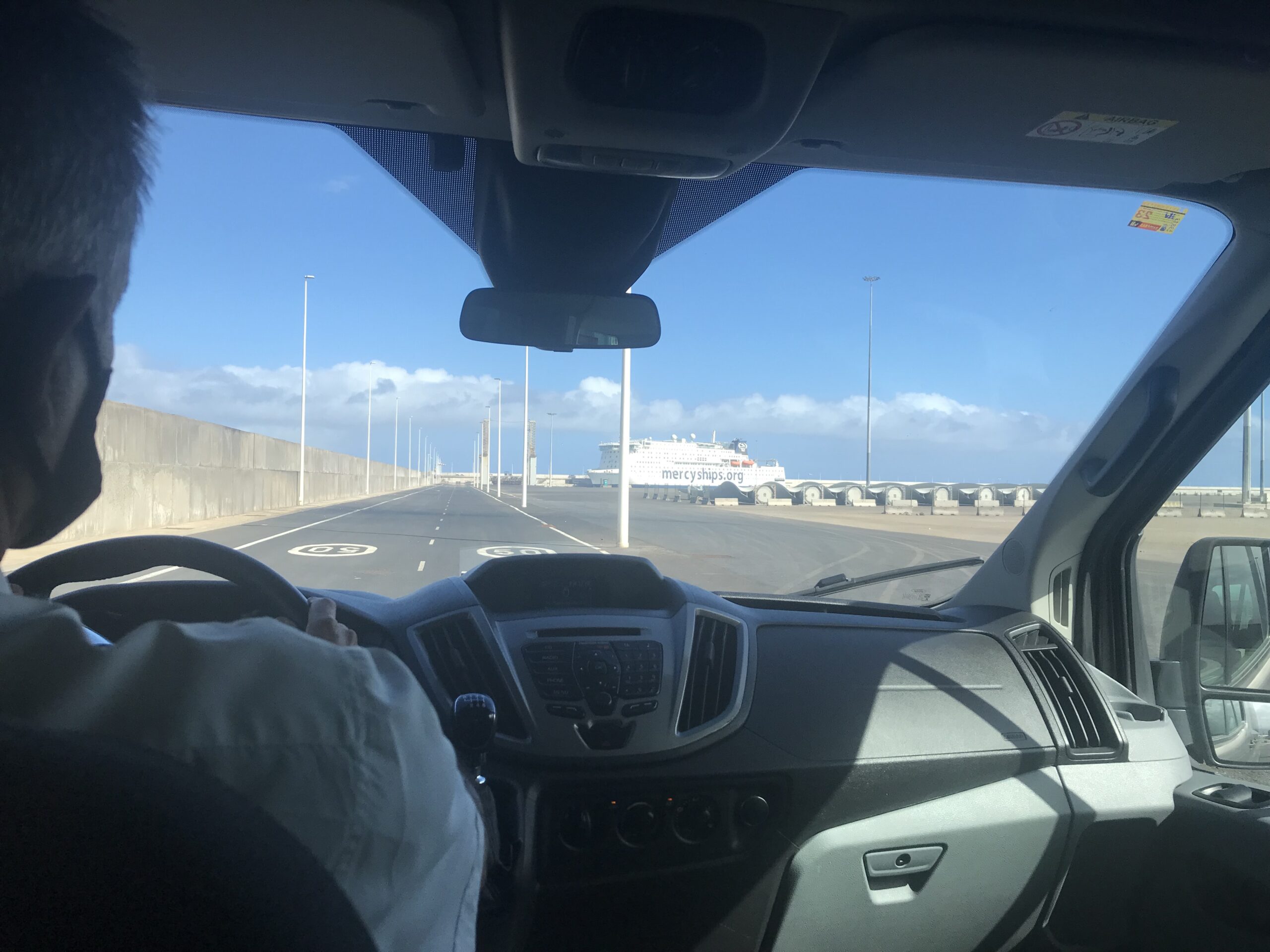 Mijn vijf tassen en ik kwamen met de taxichauffeur aan bij een 10+ persoons bus, vanwaar ik een privérit kreeg naar de haven. Ik settelde mij helemaal voorin in het midden, zodat ik met de beste man kon praten. Dit was helaas niet eenvoudig; aan de antwoorden op mijn vragen begreep ik dat hij niet alles verstond. Hij lachte steeds vriendelijk, en na enkele vragen opnieuw te hebben gesteld, deed ik maar steeds of dat een juist antwoord was op mijn vraag. Het dorre en droge was meteen goed zichtbaar: het zuiden van het eiland (waar ik mij bevind) is het tegenovergestelde van het noorden (groen en nat). Na een korte rit van slechts zeven minuten was de Global Mercy voor het eerst zichtbaar. We moesten echter nog ongeveer vijf minuten rijden, wat wel aangeeft hoe groot het schip is. Het was heel gek om mijn drijvend huis voor de komende vijf maanden voor het eerst te zien.