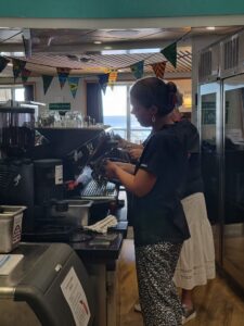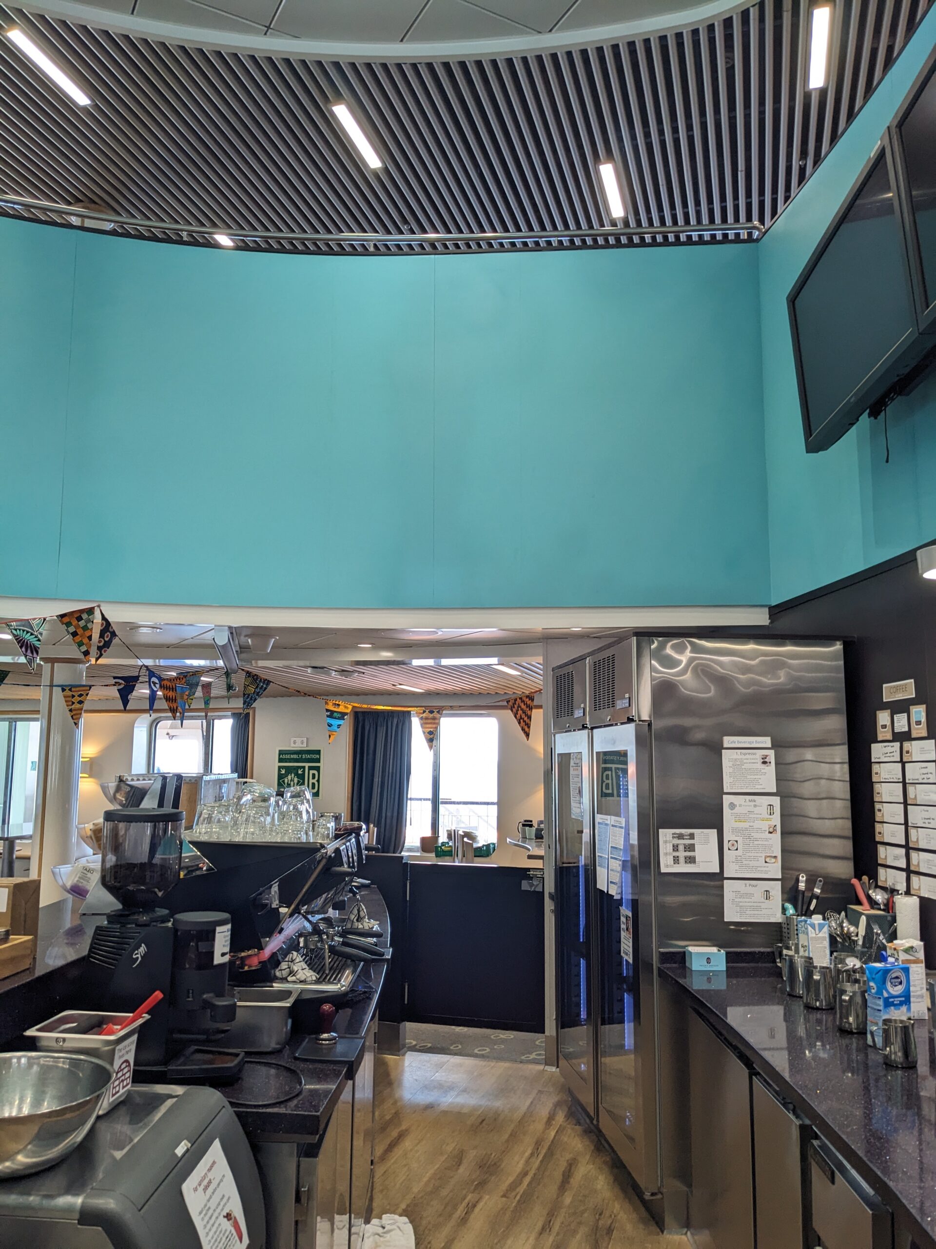 Mijn tweede week aan boord, heb ik de hele week in de Ship Shop gewerkt. De maandag daarna werden de werkzaamheden in het Cafe afgerond en na een grondige poetsbeurt, het terug verhuizen van alle spullen en een trainingsmiddag, kon het Cafe op dinsdag open! Daar was de crew heel blij mee, want hoewel je ook koffie en thee in de diningroom kan halen, smaakt de koffie uit het Cafe toch het allerlekkerste. Nu het Cafe ook open is, werk ik de ene dag in het Cafe en de andere dag in de Ship Shop. Dat houdt het werk wat afwisselender, maar het Cafe is toch wel mijn favoriet.Rond 10:00 hebben heel veel mensen koffiepauze en dan kan het erg druk zijn in het Cafe. Een uitdaging, maar ook wel heel leuk! Daarnaast leer je heel veel mensen kennen en kan je gezellig even een praatje maken. Nog nooit in mijn leven heb ik zoveel en zoveel verschillende soorten koffie gemaakt! Dat was in het begin wel even oefenen, maar het lukt steeds beter!