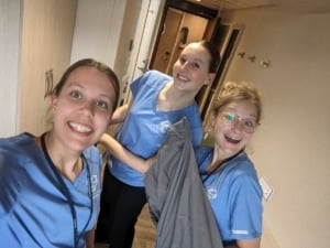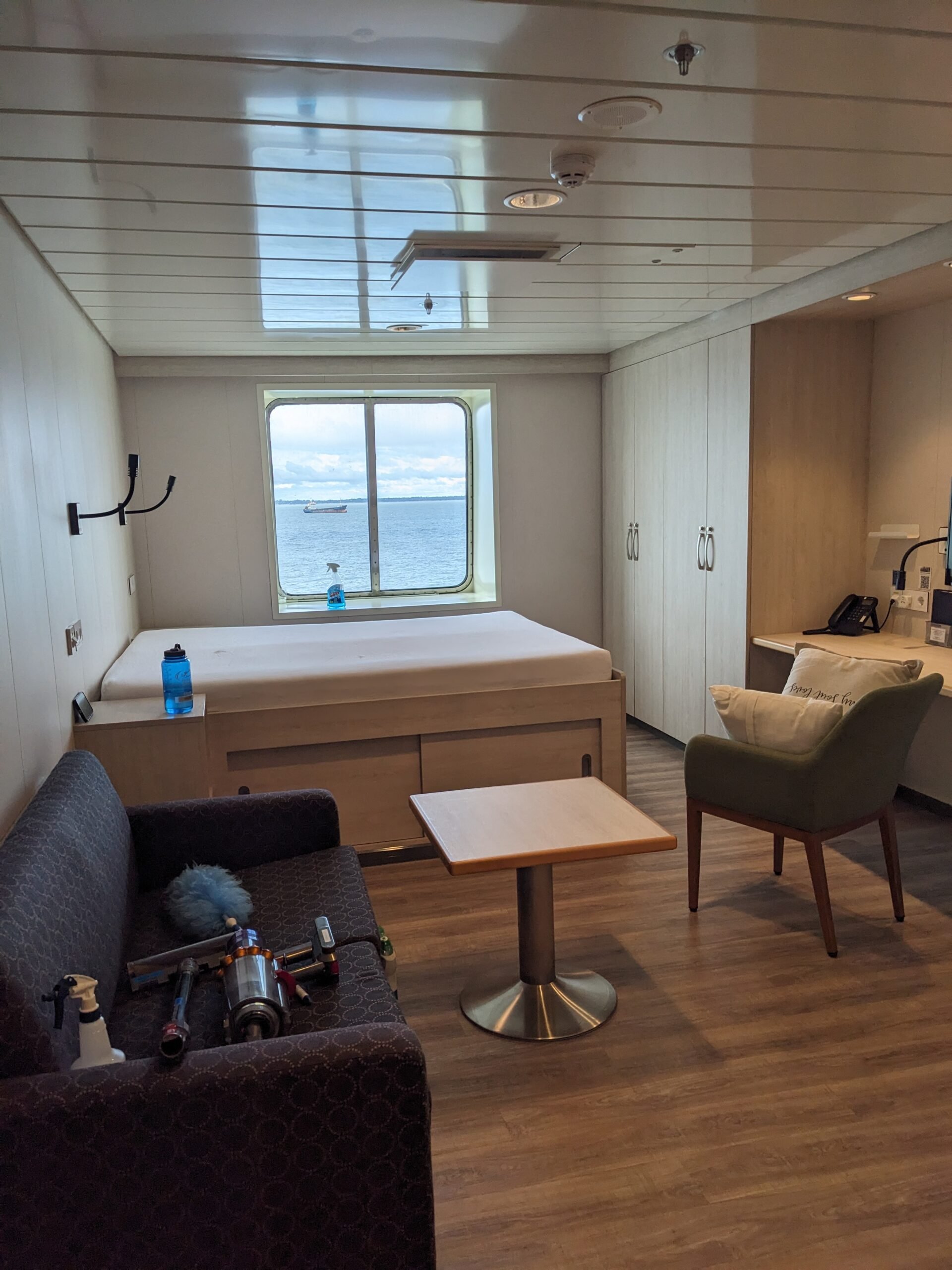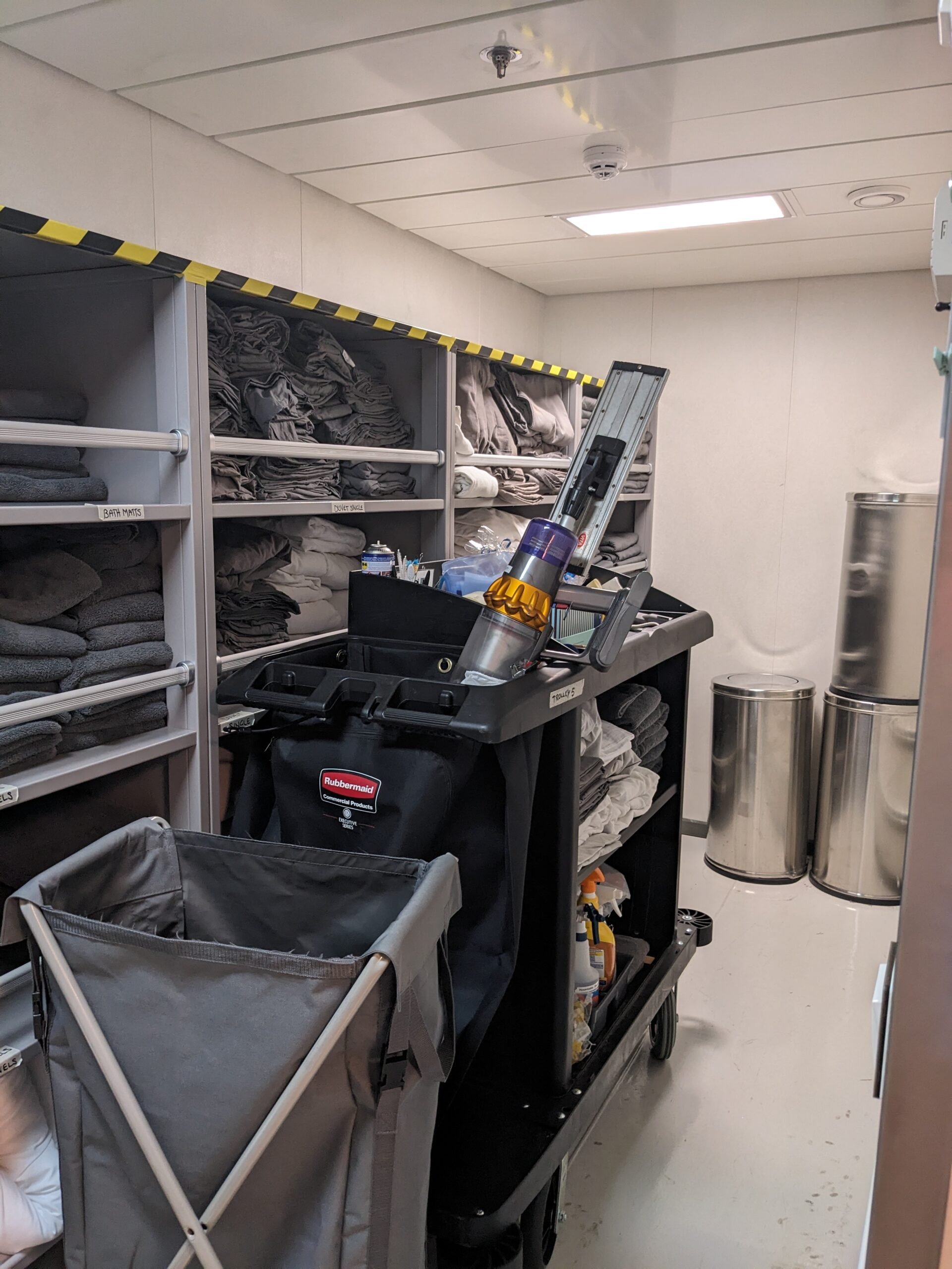 Tot 28 september heb ik als Sales Staff in het Cafe en in de Ship Shop gewerkt. De 3 weken daarna heb ik in Hospitality gewerkt. Dat vond ik heel leuk! Even heel wat anders qua werkzaamheden en je komt op zoveel plekken in het schip! Het hospitality team maakt alle cabins schoon en gereed voor aankomst van nieuwe crew. Geeft tours van het schip en informatie aan nieuwe crewleden en ze helpen bij evenementen en bezoek van gasten aan boord. Nog nooit in mijn leven heb ik zoveel bedden opgemaakt, zoveel vloeren gedweild en zoveel badkamers en wc’s schoongemaakt. Het was hard werken, maar ik heb ervan genoten. Wat een ontzettend gezellig team (een dweilstok werkt prima als microfoon als er gezellig wat muziek aanstaat tijdens het schoonmaken!) en wat een dankbaar werk. Het is zo fijn dat wanneer je aankomt op het schip, je cabin netjes is schoongemaakt, je bed is opgemaakt (dit is de enige keer dat je bed voor je wordt opgemaakt!) en dat de handdoeken en koekjes (ook eenmalig ) klaarliggen.