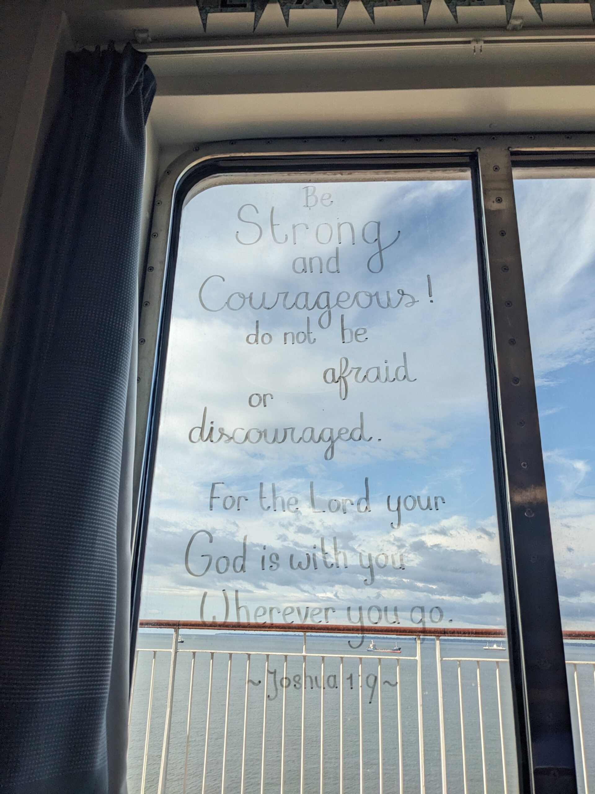Wat een bijzondere verrassing en wat een mooie boodschap. Hij vertelde iets bij Joshua 1:9: ‘ Be strong and courageous, do not be afraid or discouraged. For the Lord your God is with you wherever you go.’ Een mooie bemoediging in de week dat ik weer naar huis zou reizen. Wat zag ik er tegenop om weer naar huis te gaan. Ik heb zo’n goede en mooie tijd gehad aan boord. Ik ben zo ontzettend dankbaar voor alles wat ik heb mogen meemaken en voor alle lieve mensen die ik hier heb mogen ontmoeten, ik heb er eigenlijk geen woorden voor. Dat ik zo’n goede tijd heb gehad, maakt het alleen maar moeilijker om weer naar huis te gaan. Ik heb ook heftige en moeilijke dingen gezien en meegemaakt, maar door alles heen is God zo goed! Dat besef kwam hier heel dichtbij.