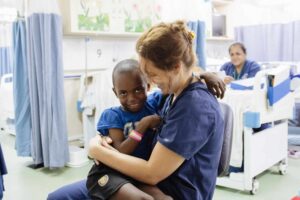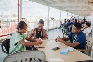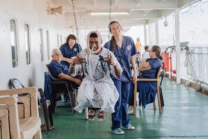 Voor ik afsluit, een van de mooiste momenten voor de kindjes in het ziekenhuis is: deck 7 time. Het uurtje dat ze naar deck 7 mogen. Zoals ik volgens mij in een eerdere blog heb geschreven, het ziekenhuis is op deck 3 en heeft geen ramen. Op deck 7 is er ruimte voor de patienten ingericht zodat ze heerlijk even een uur naar buiten kunnen staren, spelletjes spelen, kinderen kunnen rondscheuren en even in de buitenlucht kunnen zijn. Voor de kinderen die niet mogen lopen vanwege hun operatie kunnen mensen in het schip zich inschrijven om hen naar boven te dragen, want er zijn geen liften in het schip. Zo mooi dat er altijd een hele rij mensen staat te wachten om de kids naar boven te dragen. De sterke mannen dragen met alle liefde en enthousiasme de oudere kinderen (denk aan 14 jaar oude kinderen met hun benen in het gips) naar boven en een uur later weer naar beneden. Een fantastische mogelijkheid voor mensen die niet in het ziekenhuis werken om daar toch iets aan bij te dragen. Uiteindelijk gaat het hier om de operaties die worden uitgevoerd. Mensen die in de machinekamer, keuken, housekeeping, of waar dan ook werken buiten het ziekenhuis krijgen er niets van mee. Dit is zo’n mooi bijzonder moment waar het gaat om de mensen en we met z’n allen de MercyShips community vormen.