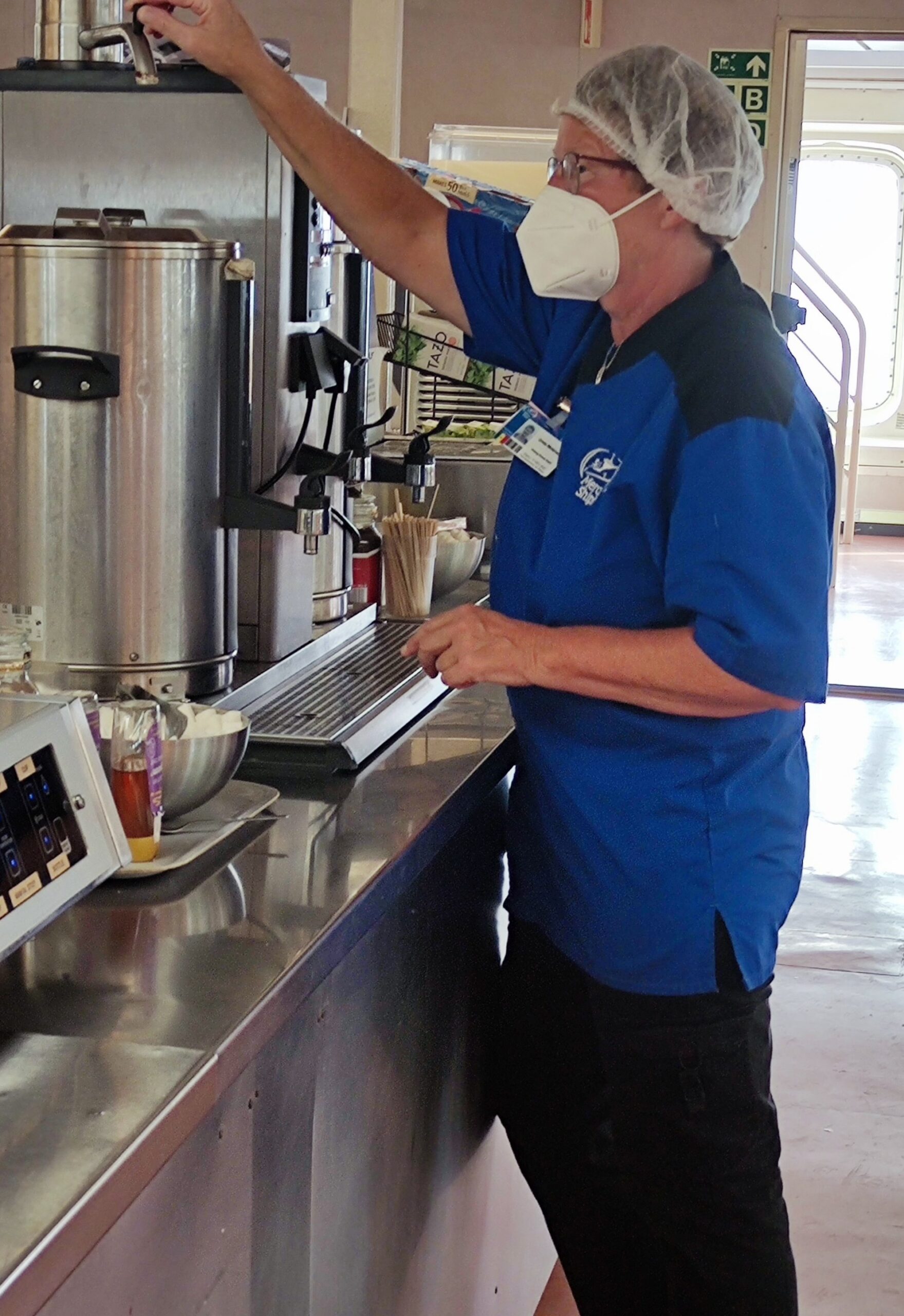 Alle maaltijden voor de bemanning (hieronder valt iedereen die op het schip werkzaam is) worden door ons opgeschept! Dit is veranderd tijdens de Covid-periode. Voor de Covid-tijd kon iedereen namelijk zelf langs het buffet lopen en opscheppen! Het werk is daardoor arbeidsintensiever geworden.