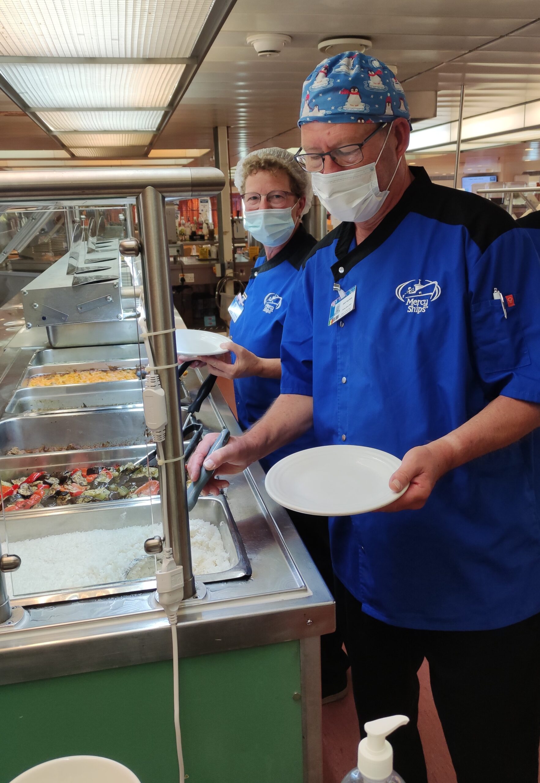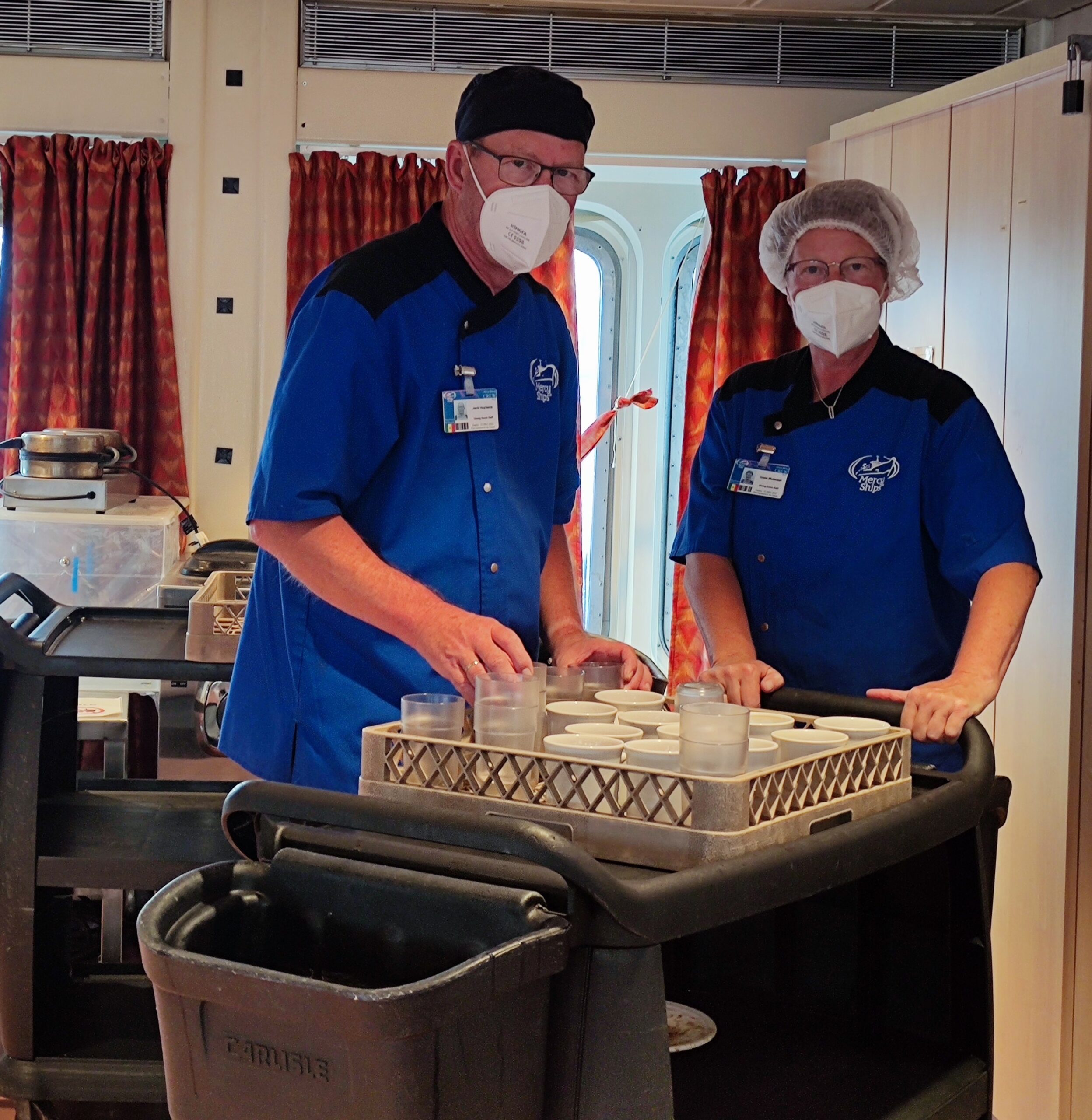 Alle maaltijden voor de bemanning (hieronder valt iedereen die op het schip werkzaam is) worden door ons opgeschept! Dit is veranderd tijdens de Covid-periode. Voor de Covid-tijd kon iedereen namelijk zelf langs het buffet lopen en opscheppen! Het werk is daardoor arbeidsintensiever geworden.