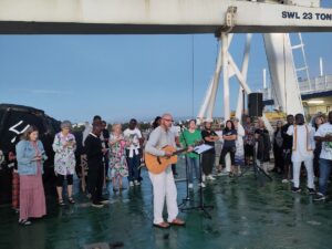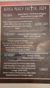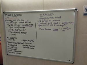 Bij de ingang van het ziekenhuis gedeelte van het schip staat een Prayer board met gebedspunten. Hierop staan oproepen om te bidden voor bijvoorbeeld het tijdig beschikbaar komen van nieuwe vrijwilligers die voor specifieke taken heel hard nodig zijn en om te danken voor de allerlei zaken die soms op wonderlijke manieren op het laatste moment toch nog goed komen!