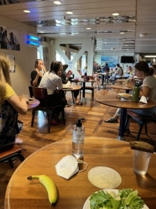 Het dagelijks delen van elke maaltijd met elkaar. Op de foto zie je hoe wij in het cafe aten in COVID code paars en rood (tijdens een Corona uitbraak aan boord), er mag dan slechts een persoon aan tafel zitten, tenzij je roommates bent.