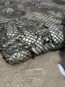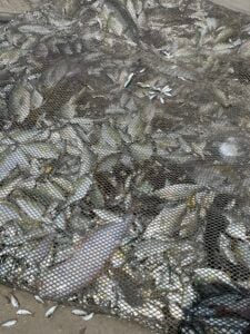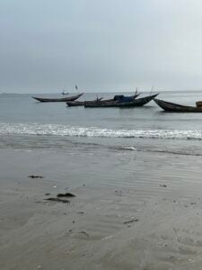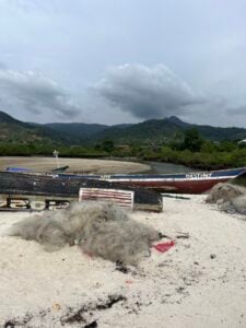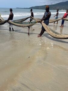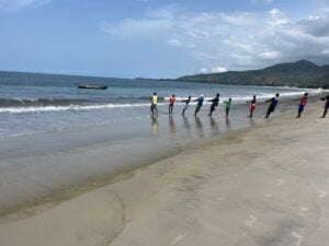 De volgende ochtend toen we aan het ontbijt zaten zagen we een aantal mannen hard aan een touw trekken. Een van de mannen van het resort legde ons uit dat het vissers waren die hun net binnen haalde. Het uitvaren, uitgooien van het net en weer op het land krijgen duurt zo’n 4 uur en het is hard werken. We volgde de vissers in hun proces. Verder op stond een 2de groep ook aan een touw te trekken dit bleek de andere kant van het net te zijn, langzaam bewogen ze zich naar elkaar toe. Na ruim 2 uur kwam dan eindelijk de vis aan land. Een hoop gespetter in een net vol met vis. Zoveel verschillende soorten en maten, mooi om te zien. De kleine visjes die buiten het net lagen werden weer terug gegooid in zee.