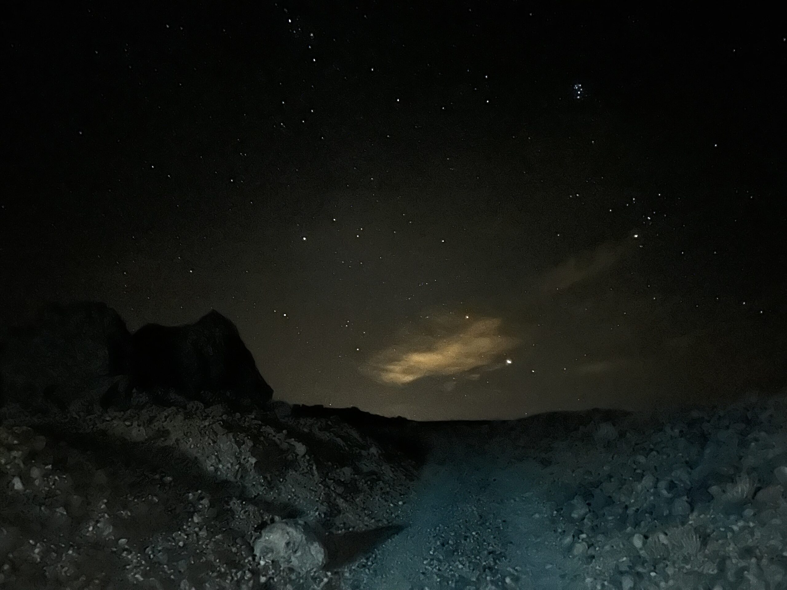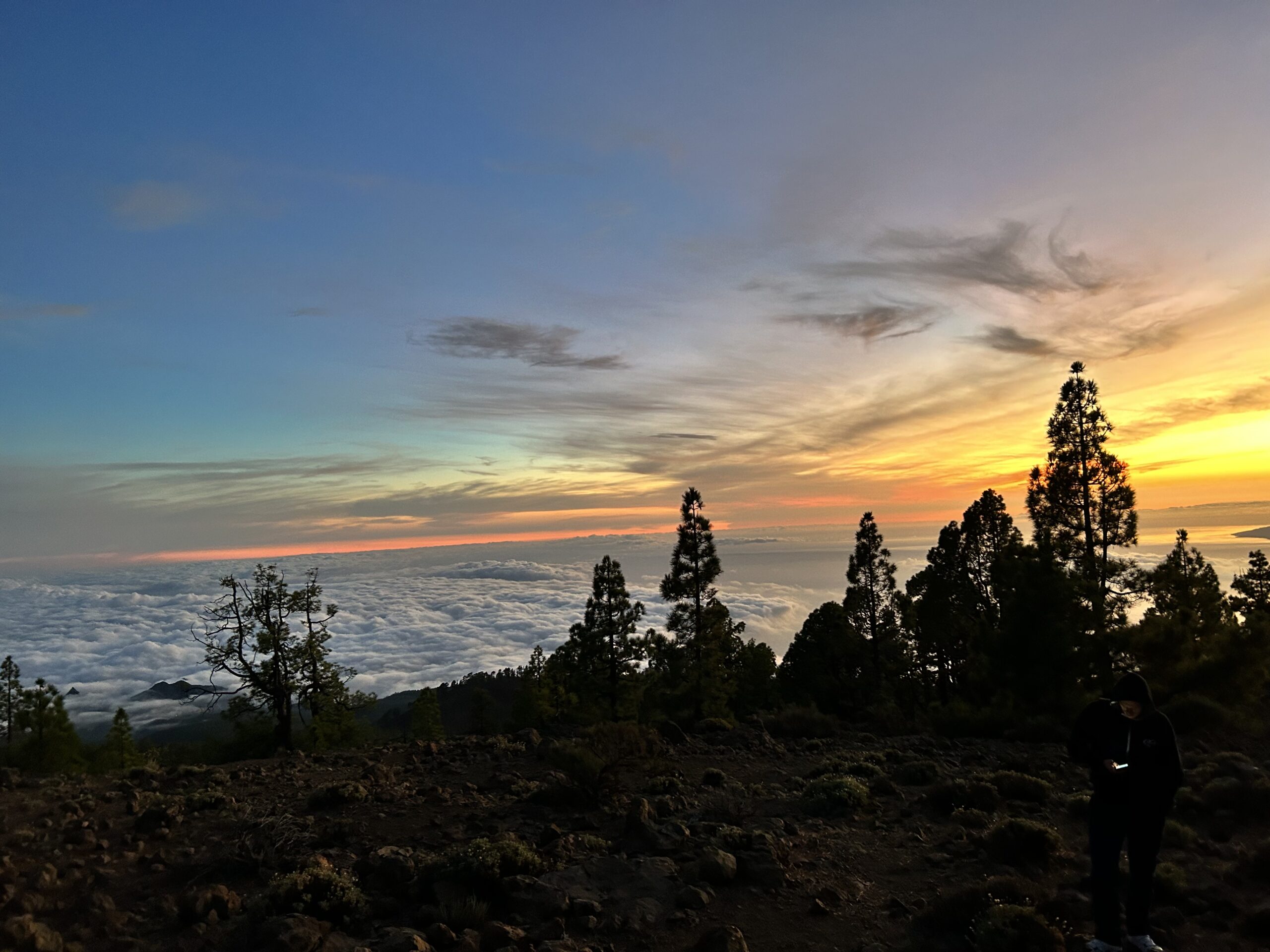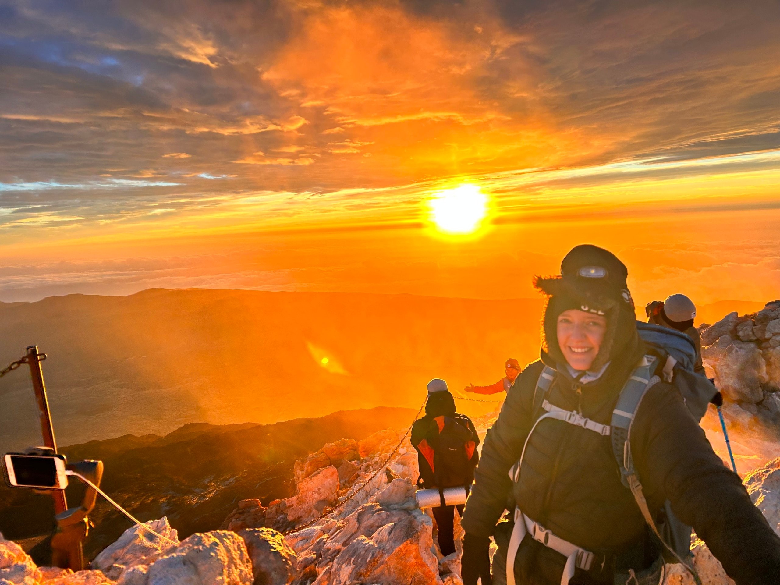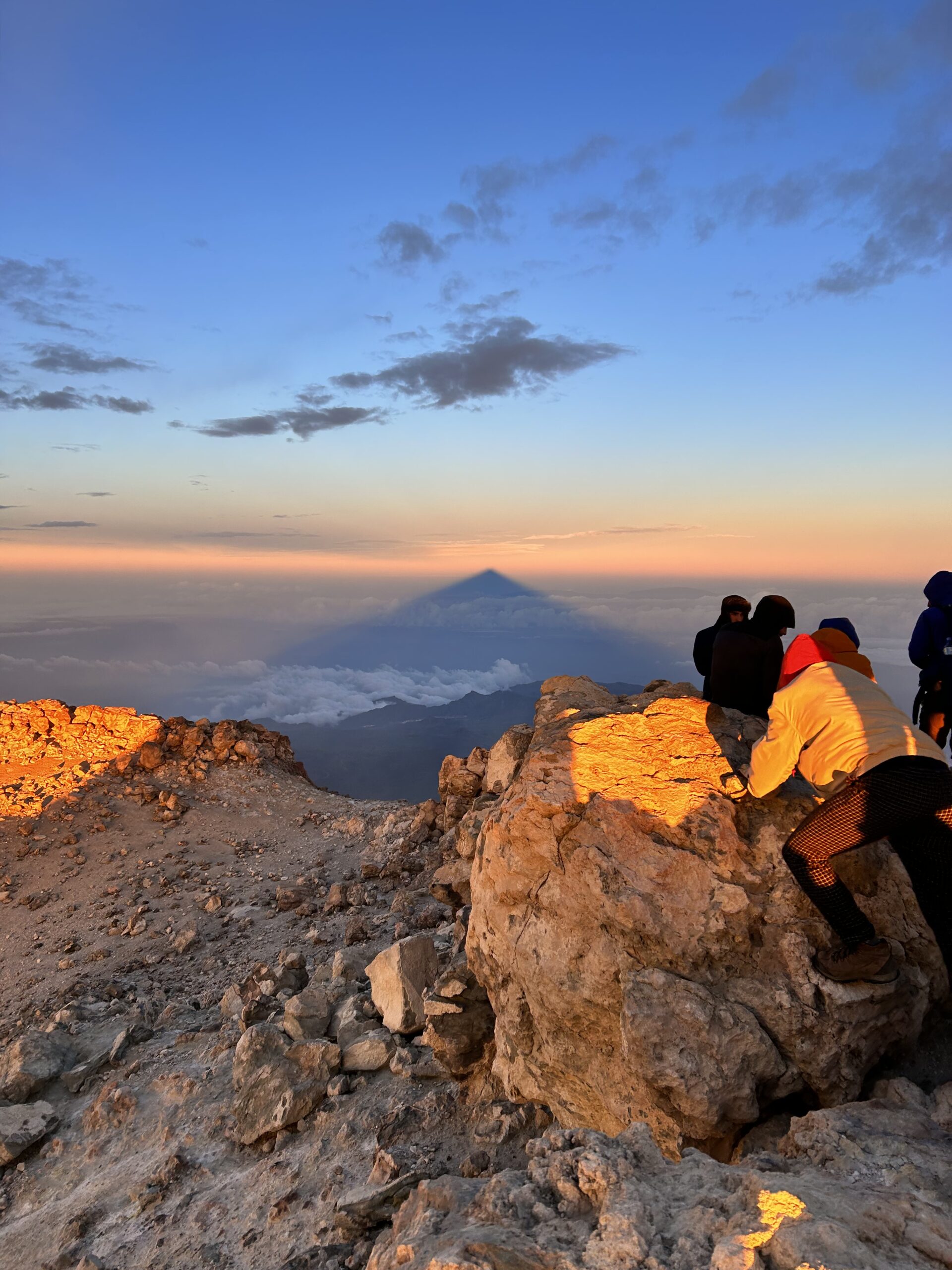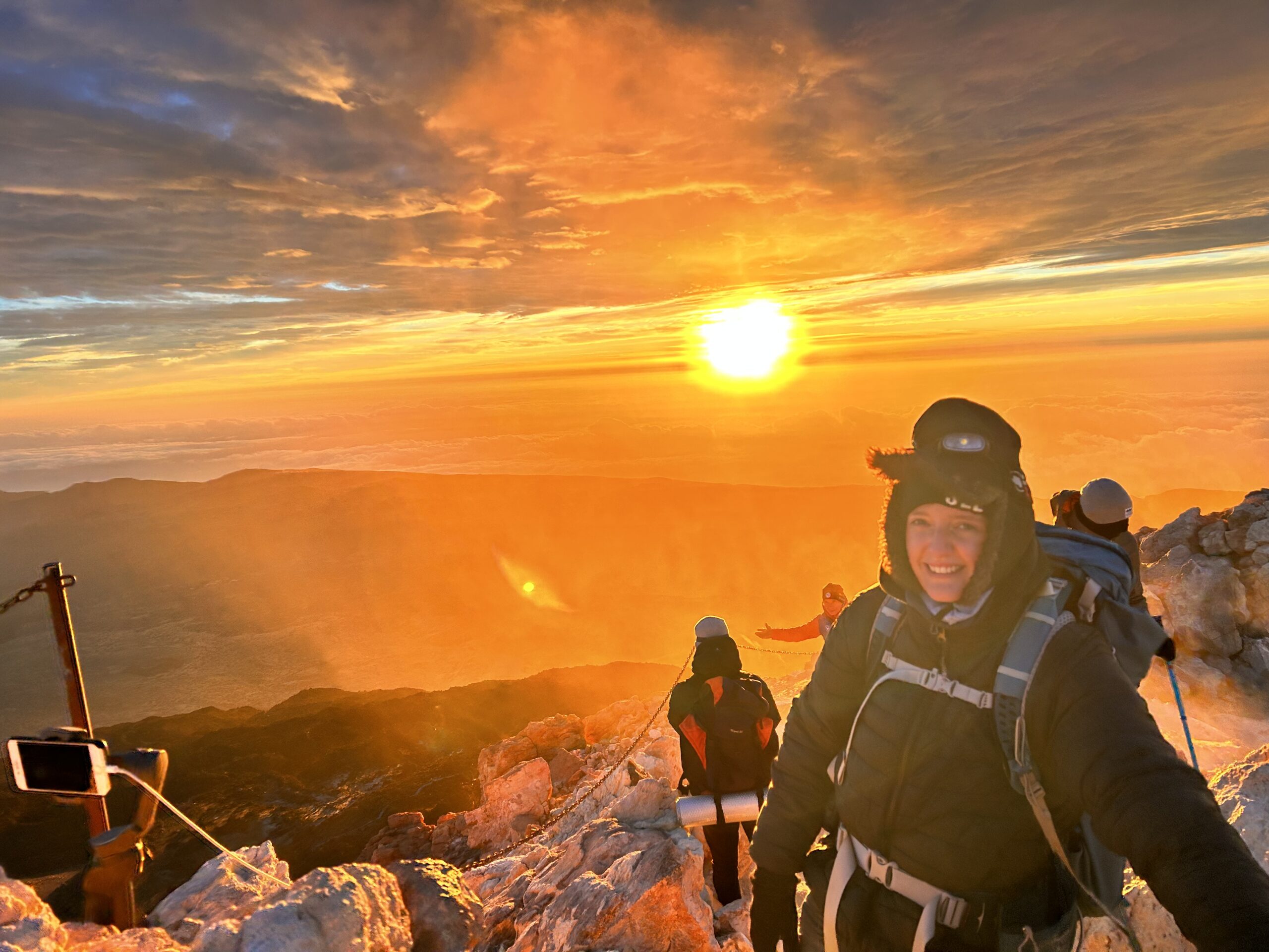 Rond zes uur ’s avonds vertrok er een groep van 25 personen om sterren te kijken in het nationale park van de El Teide. We begonnen met het bekijken van de zonsondergang, waarna we een stuk verder de berg opreden om naar de sterrenhemel te kijken. Het gebied is de op twee na beste plek ter wereld om sterren te kijken en wordt door de NASA ‘venster naar het universum’ genoemd. Hoewel het enigszins bewolkt was op sommige momenten, konden we inderdaad prachtige taferelen aanschouwen: van de Melkweg naar tientallen vallende sterren en goed zichtbare planeten. Rond half 12 ’s avonds werd ik met een ander tweetal afgezet aan de voet van de Montana Blanca op ongeveer 2.200 meter hoogte. Op dat moment begon mijn zwaarste tocht ooit: van 2.200 meter hoogte in 4,5 uur naar het hoogste punt van het eiland, 3.718 meter. We waren goed voorbereid met veel lagen kleding, liters water en voldoende voedsel. Omdat we eigenlijk te vroeg waren begonnen, moesten we op 3.000 meter hoogte drie uur buiten half slapend doorbrengen. De intense kou maakte de ervaring zeer bijzonder. Rond kwart voor zeven ’s ochtends kwamen we bij de krater en het hoogste punt aan, om daarna te genieten van een prachtige zonsopgang. Achter ons zagen we de enorme schaduw van de vulkaan, de grootste ter wereld bij zonsopgang en -ondergang. Ook een lava ‘experience’ bleef niet uit: rond de krater waren meerdere gaten waar rook uit opsteeg. Als je even je hand voor een van deze gaten houdt, weet je wel dat de vulkaan nog steeds actief is. Vanwege de enorme wind konden we helaas niet terug met de kabelbaan, wat betekende dat we dezelfde weg terug moesten lopen. We mochten dit (slechte) nieuws ook brengen aan onze medebergbeklimmers, wat voor sommigen zichtbaar als een schok kwam. Niet iedereen was ook even goed gekleed op deze expeditie; een groepje mensen probeerden zich met gouden reddingsdekens warm te houden. Tijdens onze wandeltocht naar beneden kwamen we een helikopter, twee EHBO’ers en meer dan tien ambulances tegen. We wisten wel hoe laat het was. Bijkomen van deze tocht heeft voor mij wel meer dan een week geduurd, maar het was het meer dan waard.