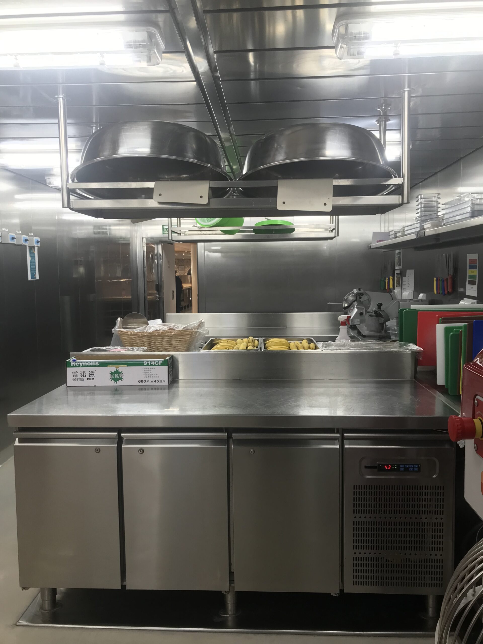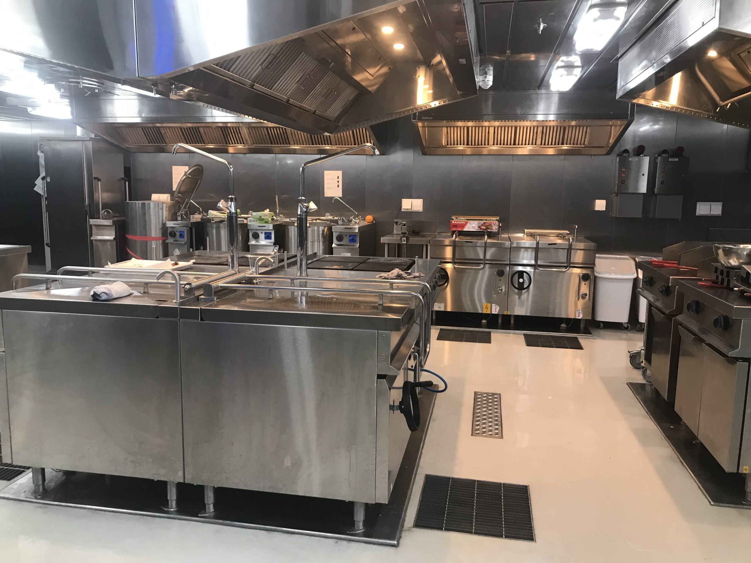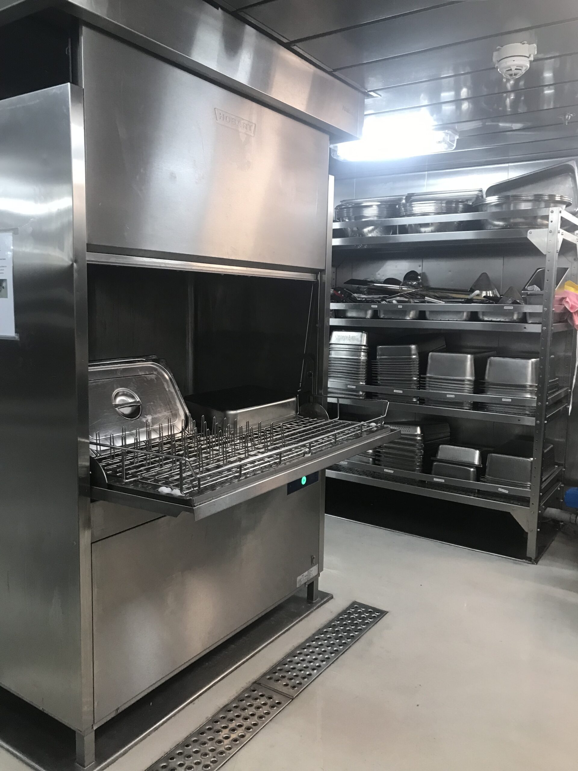 Mijn werkdagen spendeer ik natuurlijk in de keuken, dus hierbij een aantal foto’s van de keuken. De eerste foto is de ‘cold side’ (koude kant), waar ik mij voornamelijk bevind en we het koude voedsel bereiden. De twee foto is van de ‘hot side’ (hete kant), waar voornamelijk rijst, pasta, frituur en toebehoren worden bereid. De derde foto is de ‘scullery’ (afwaskeuken), wat voor zich spreekt. Als het eten geserveerd wordt, is het altijd belangrijk om te kijken of er nog genoeg is, om het eventueel aan te vullen. Zo ontstaan er soms ook leuke, korte gesprekken in de rij. Op een of andere manier kwam ik er met iemand op dat ik nog weinig tot geen foto’s had van mij in mijn keukenkloffie, waarna deze spontane foto volgde.