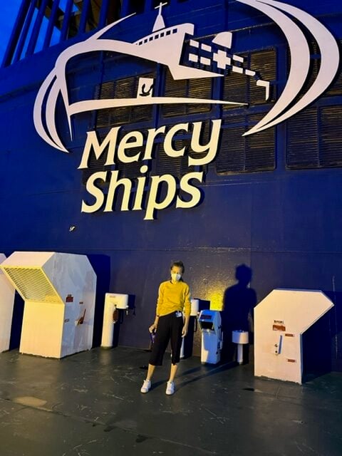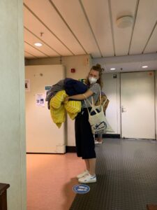 Sinds afgelopen maandag is er heel veel gebeurd. Dinsdagochtend mocht ik gelukkig uit isolatie en ben ik met m’n hele hebben en houden weer terug verhuisd naar m’n oorspronkelijke cabin. *Sorry als ik tussendoor Engelse woorden gebruik, maar dit is het Mercy Ships jargon. 😉 Nadat ik mijn cabin een beetje geinstalleerd had, kon ik direct richting de lunch. Het eten verschilt per dag, dus het is elke keer weer een leuke verrassing. Het eten is overigens heerlijk en wordt met veel liefde geserveerd!!! Vanwege Covid scheppen de mensen die in de diningroom werken het eten op, daarbij moet je er wel op letten dat je je zin begint met: ‘a liiiiiitle bit of…’ Ik denk dat ik daar verder niet veel aan toe hoef te voegen als ik zeg dat ik tot nu toe slechts één keer m’n bord leeg heb gekregen… Verder doet de diningroom (lees:deiningroom) zijn naam eer aan, want het schip schommelt op dat punt behoorlijk heen en weer. Na de lunch kreeg ik mijn eerste ‘ship tour’, een uitgebreide rondleiding over het schip. Een van de taken van Hospitality is om nieuwe vrijwilligers ship tours te geven, dus dat zal ik binnenkort ook gaan doen. Inmiddels snap ik de logica en weet ik dat ik niet over ‘left and right’ maar over ‘bow, aft, port and starboardside’ moet praten op een schip. Een zekere zeilfamilie had mij dat natuurlijk al wel eens eerder verteld, maar ik zie er nu de ernst pas van in. 😉