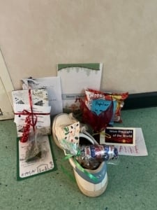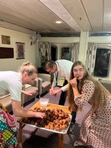 Op de 24e was er een kerstnachtdienst op de Africa Mercy, er was muziek, Bijbellezing in verschillende talen en er werden komische filmpjes laten zien. Na deze dienst kon iedereen gelijk doorlopen naar het prachtig versierde café, om te genieten van veel te veel lekkernijen, mulled wine en gezelligheid met elkaar. Die nacht mochten we (weer, want met Sinterklaas ook al) onze schoen zetten en die werd ‘s nachts gevuld met lekkere koekjes, chocolaatjes, cadeautjes en kaartjes van andere crewmembers. Namens Hospitality hebben we pakketjes met koekjes (waarvan we er ongeveer 250 gebakken hebben) en chocolaatjes gemaakt en die gingen we dus ‘s avonds uitdelen.