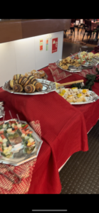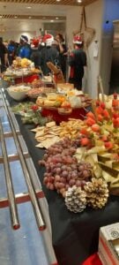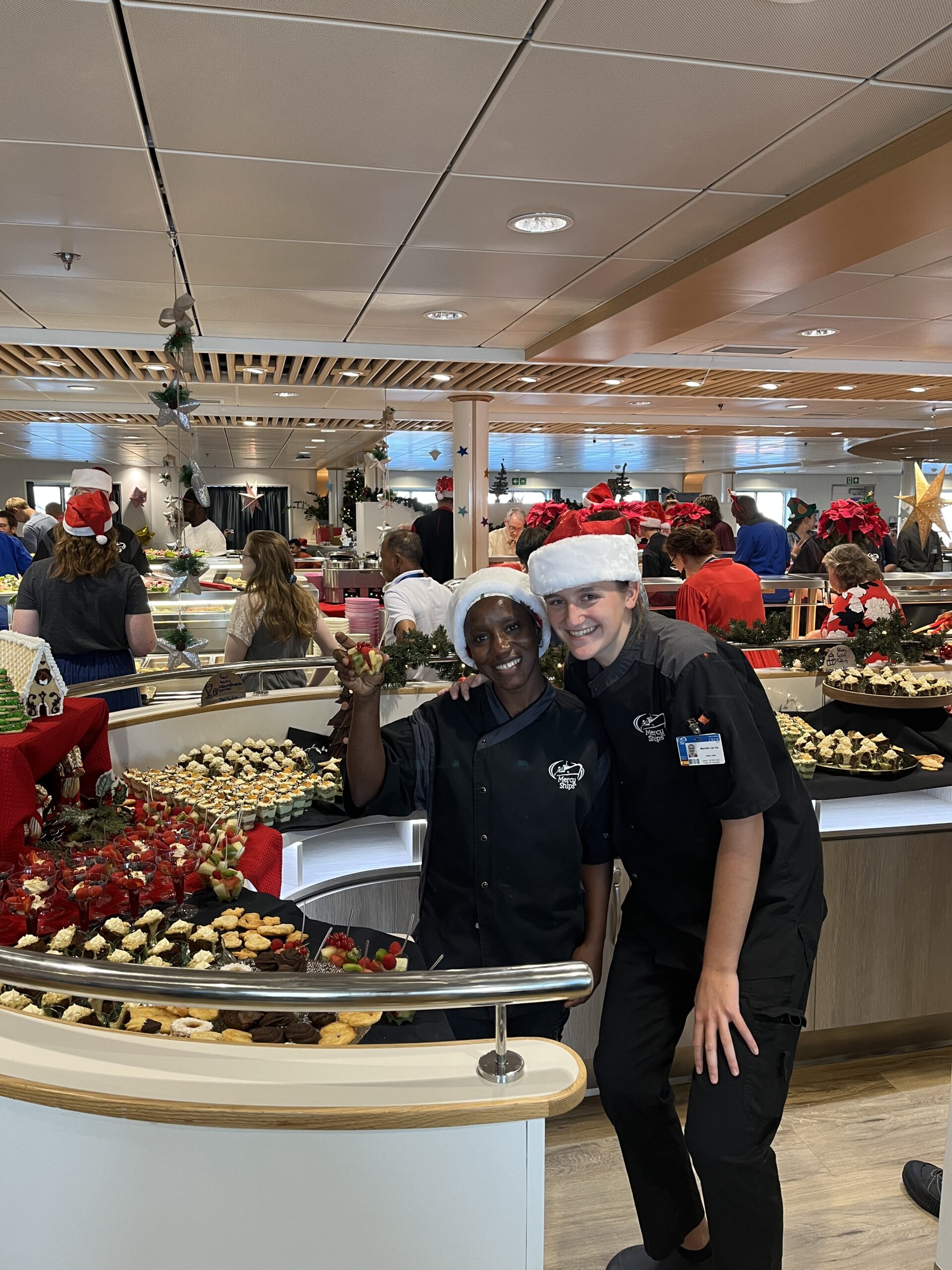 Daarna heb ik nog de livestream van een kerstnachtdienst van een Nederlandse vriendin meegekeken en toen was het bedtijd. ‘s Ochtends konden we heerlijk wakker worden met weer lekkers in het cafe op de Africa Mercy, dit keer met alleen de ‘AFM’ers’. Gebakjes, broodjes, gepocheerde eieren, fruit, sap en ga zo maar door. Daarna was er een kerkdienst op de Global Mercy wat echt een vrolijk (kerst)feest was. Na de dienst konden we doorlopen voor een lunch in de diningroom en daar vielen onze monden echt van open. Zoveel en zo mooi! De galley en diningroom hebben echt hard hun best gedaan en met resultaat!