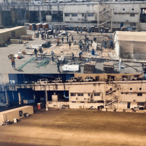 Want laten we het even hebben over het weekend van 22 eind oktober. Dit is een van de weekenden die de boeken in ging. De volgende foto’s laten zien dat de hele bemanning helpt om de tenten op de kade af te breken en de kade volledig leeg te maken. De eerste foto is een voor en na foto, van het inpakken. Dit was een zeer uniek weekend in de geschiedenis van Mercy Ships. Vanwege rijsttekorten in Senegal had de regering ons gevraagd om van onze oude haven naar een nieuwe te verhuizen. De vraag die regering ons stelde om het schip te verplaatsen was een enorme opgave. Het terrein voor het schip moest namelijk dan in twee dagen worden ontruimd en ook op het andere dok worden herbouwd. Tijdens deze verhuizing zaten we ook nog eens in onze laatste maand van operaties en waren er veel patiënten nog steeds ingepland voor algemene chirurgie of maxillofaciale chirurgie. Ondanks dat we zo dicht bij het einde waren, was een vroege stop van de operaties geen optie. Aan de andere kant wilden we de Senegalese bevolking rijst niet onthouden. De enige manier was inpakken en verhuizen.