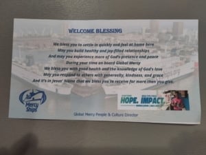 Ook werd er goed gedacht om onze veiligheid aan boord: We moesten gelijk een filmpje bekijken waarin de verschillende alarmsignalen werden uitgelegd (wat te doen bij brand?). Veiligheid wordt hier zeer serieus genomen, we zijn hier wel in een ziekenhuis…!