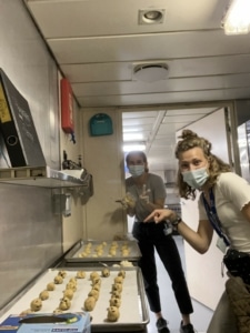 Zondag was een hele drukke dag, dat is de dag waarop de meeste nieuwe mensen op het schip arriveren. Ik heb geholpen met de zogeheten ‘embarkation’ en de shiptour. ‘s Avonds was er een kerkdienst buiten op het dok en daarna hielp ik ook met het uitdelen van koekjes. Vandaag ben ik lekker vrij en rust ik uit!