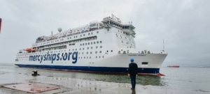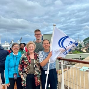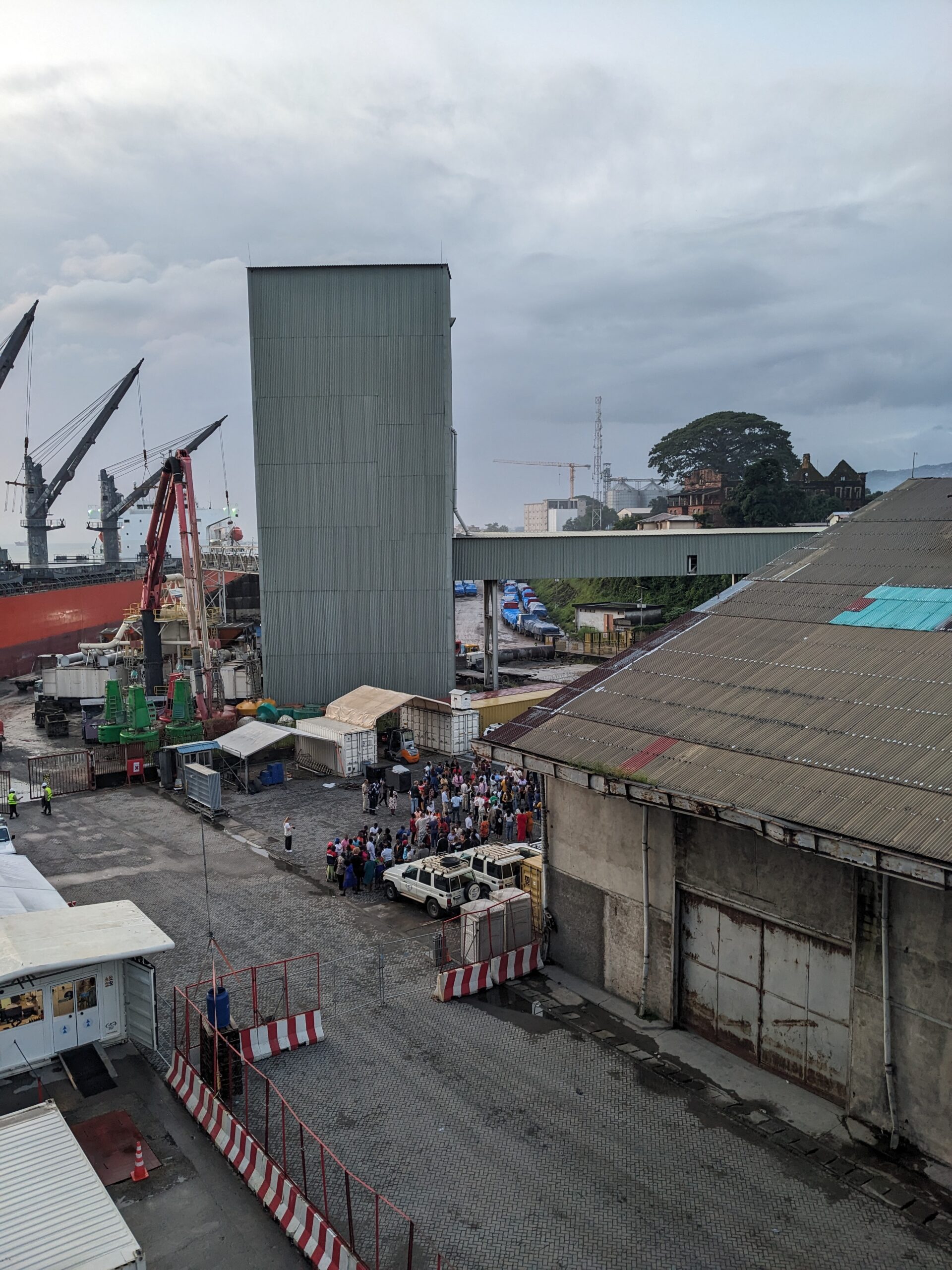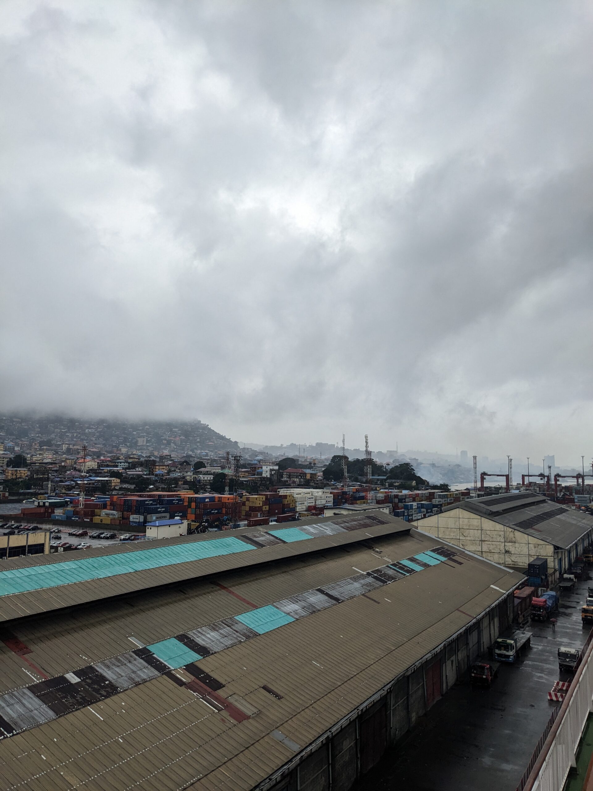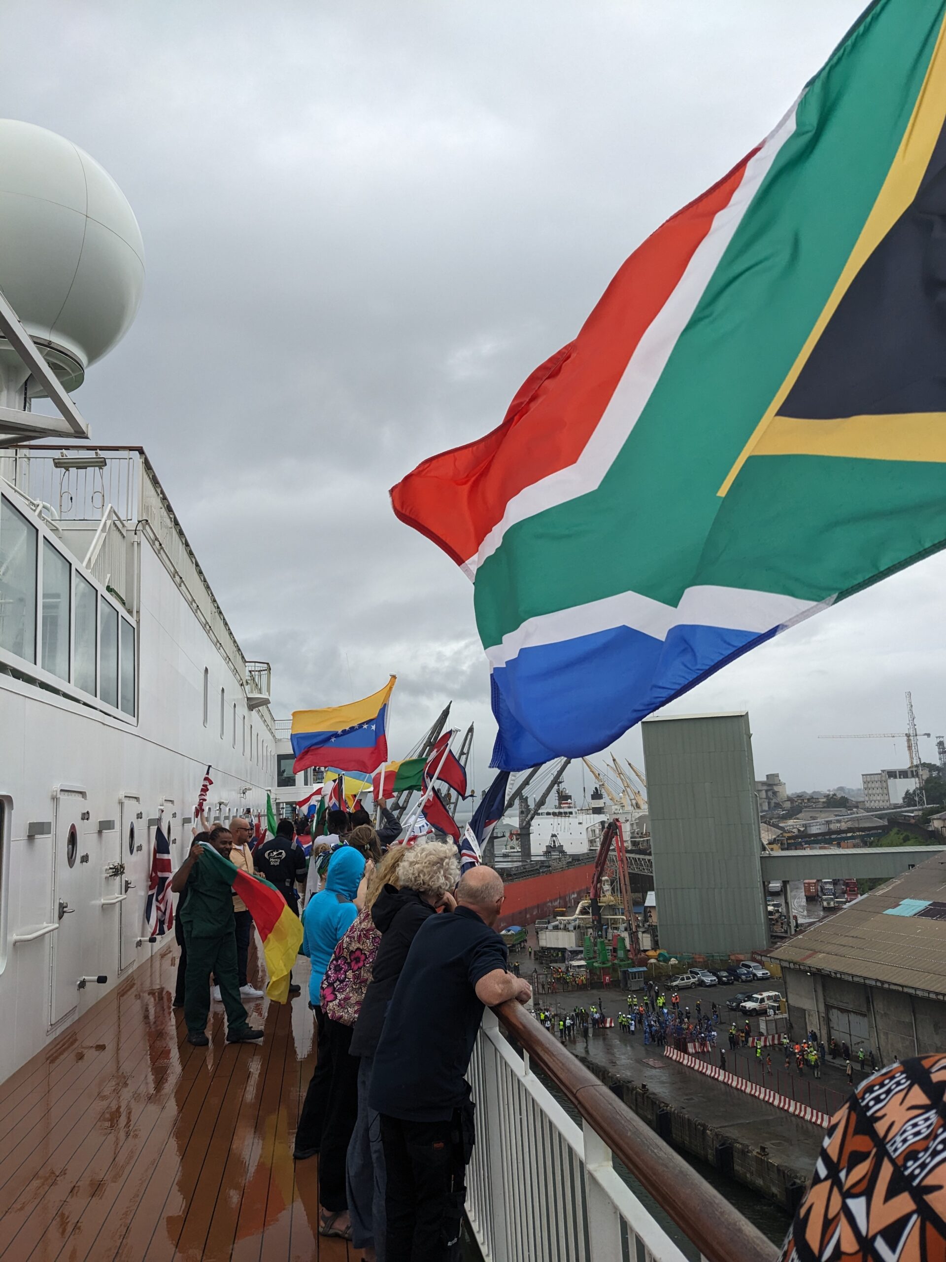 Op woensdag was het dan eindelijk zover, rond een uur of 15:00 zagen we voor het eerst in dagen weer land! Iets later, rond een uur of 17:30 kwamen we echt aan in de haven van Freetown. Zodra we in de buurt kwamen, zijn we met z’n allen bij de reling van het schip gaan staan met vlaggen van alle landen waar de vrijwilligers aan boord vandaan komen. Zo’n prachtig gezicht! Op de dock stonden mensen ons op te wachten, met instrumenten, zang en gedans werden we welkom geheten in het prachtige Sweet Salone. Zo onwerkelijk dat we hier nu echt zijn! De Global Mercy ligt weer in de haven van Freetown, het begin van een nieuwe fieldservice, waarin het schip opnieuw hoop en genezing mag brengen aan de allerarmsten in Afrika. Tel am tenki, tel am, Tel papa God Tenki! (Een lied in het Krio, dat we vaak op het schip zingen en dat ook op de dock gezongen werd toen we aankwamen in Freetown!).