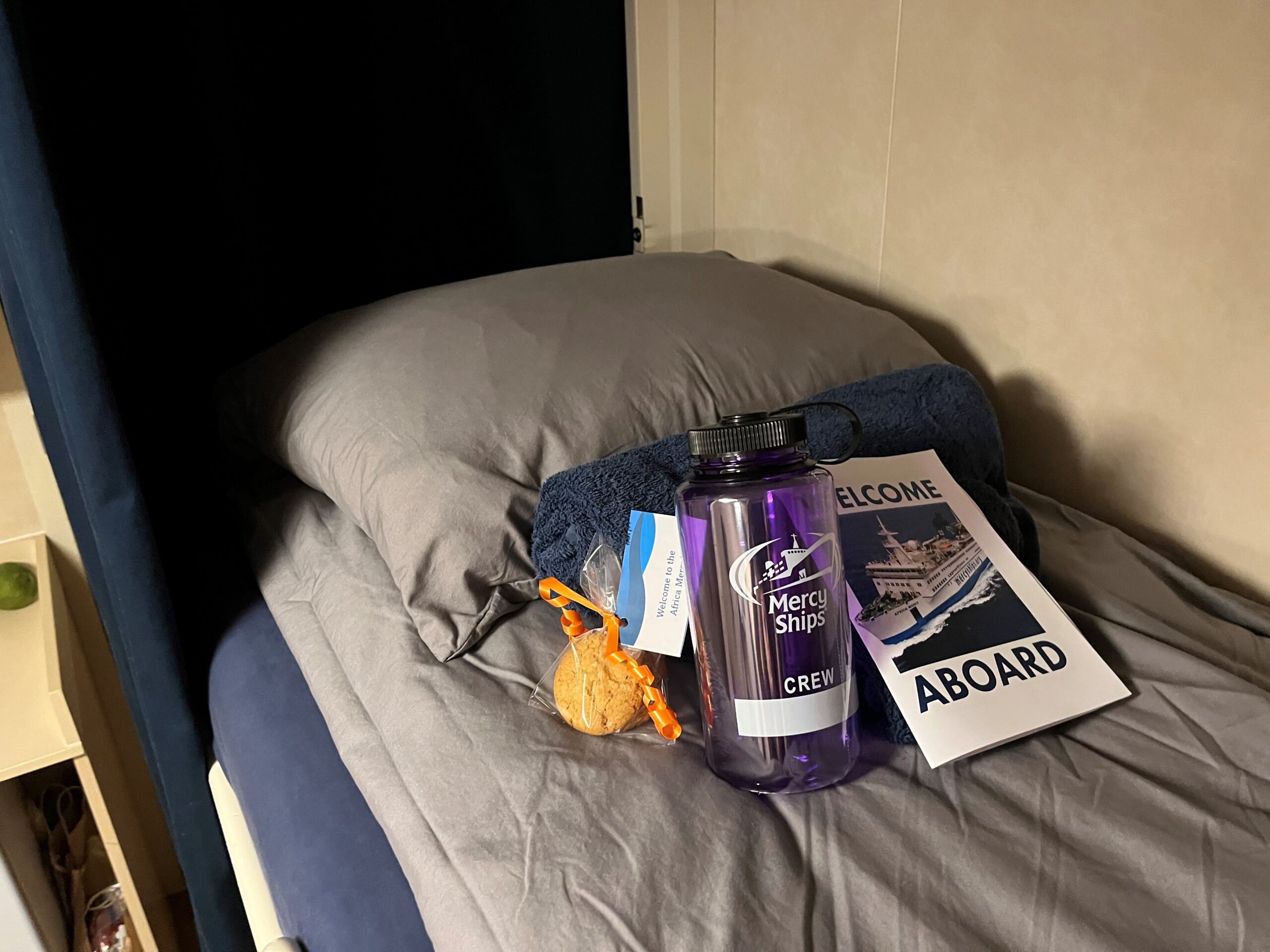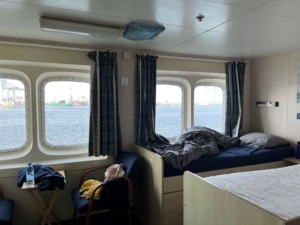 En zo reed ik vanmorgen naar het schip, wat ontzettend bijzonder om die in het echt te zien en er vanaf nu ook deel van te zijn. Alles was goed doorgegeven en na een foto voor op mijn crew badge was het op naar de Crew Clinic. Naast een onverklaarbare hoge hartslag (zal wel enthousiasme zijn) was er niks te vinden, gelukkig. Dus kon ik weer meedoen met de introductie voor de nieuwe crew. Dat was toch een beetje veel en dus ben ik toen ik eenmaal in m’n eigen cabin aankwam gelijk in bed gaan liggen. Ik slaap in een vierpersoonscabin en mijn roommates waren super aardig en behulpzaam. Ik heb een paar uur geslapen, dus heb al aan m’n nieuwe bed kunnen wennen. Toen iemand van de Hospitality kwam vragen of alles goed ging en of ik wat te eten wilde, moest ik
