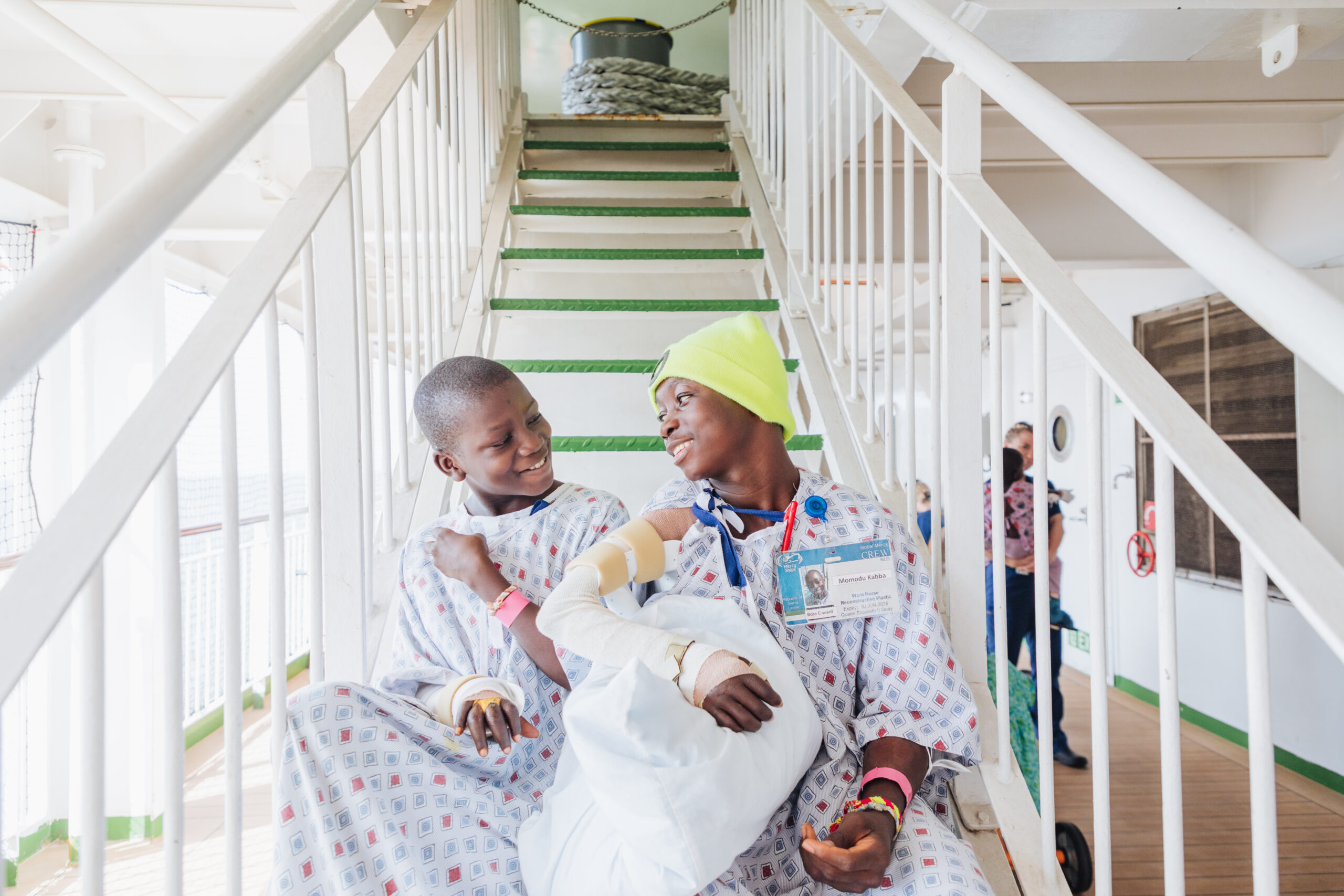 D-ward is de afdeling voor maxillo facial chirurgie, in Mercyships taal ook wel MaxFax genoemd. Hier worden volwassenen en kinderen geholpen aan gezwellen in de nek/keel of aangezicht. Daarnaast worden er ook patiënten geholpen die een schisis hebben. Het is een afdeling die net wat complexere zorg bied dan mijn afdeling. Met name omdat de tumoren soms vlak bij de luchtpijp/mond zitten en dus een bedreiging voor de ademhaling kunnen zijn. Niet voor niets zit de afdeling dan ook vast aan de IC. Het blijft, ook voor mij, bizar om te zien wat voor soort tumoren er bij mensen kunnen groeien en hoe groot die zijn! Ik heb nu 1 dienst op D-ward gedraaid. Een van de patiënten was net 1 dag na zijn operatie en bleef maar in zijn spiegeltje kijken naar zijn gezicht. Moet je voorstellen dat je jaren lang een steeds groter wordende tumor op je gezicht had en dat die nu weg is.. maar vervolgens heb je wel een enorm verband, hechtingen, zwelling, pijn, een sonde in je neus omdat je een tijdje niet mag eten.. het is best wel even aanpassen en het duurt ook echt wel even voordat het echte resultaat zichtbaar is. Heel langzaam zie je de verandering, met name in de ogen van de patiënt. Waar ze eerst weinig sprankelden zie je de vreugde steeds meer toe nemen. Ze worden hier aan boord weer in de ogen aangekeken in plaats van dat men alleen maar naar de tumor staart en ze voelen dat ook zij er bij horen en er mogen zijn. Dat is een groot onderdeel van het herstel.