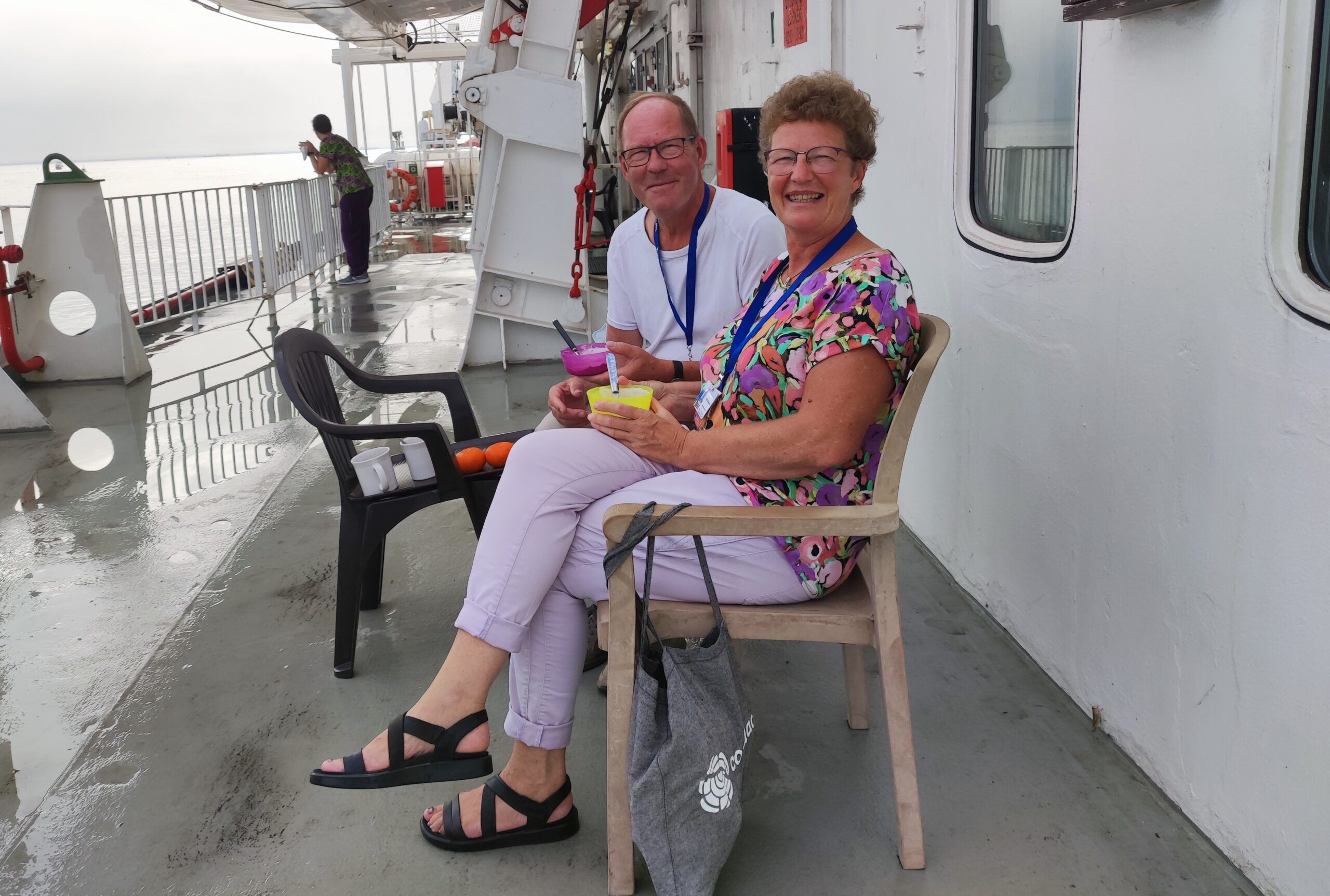 Het is hier nog steeds heerlijk weer! Op de dagen dat we vrij zijn genieten we van de buitenlucht op dek 7. Daar hebben we onderhand, samen met andere Dutchies, onze vaste stek. We zitten er dan met elkaar of gewoon samen of in je eentje! Koppie koffie mee natuurlijk….
