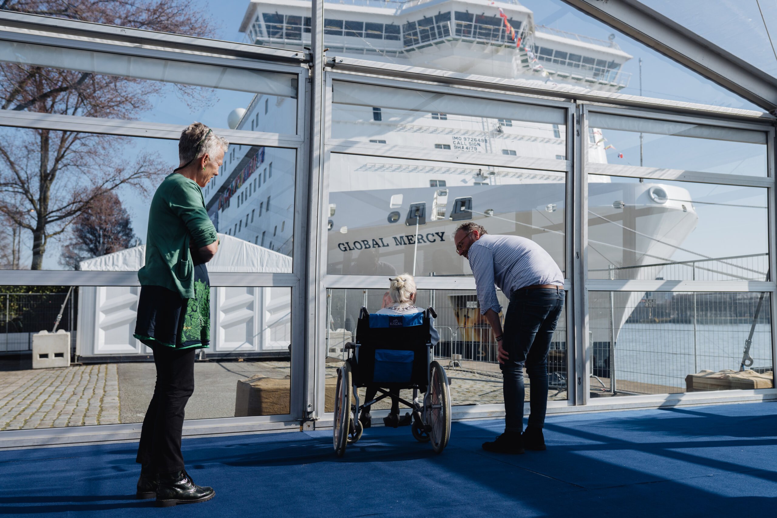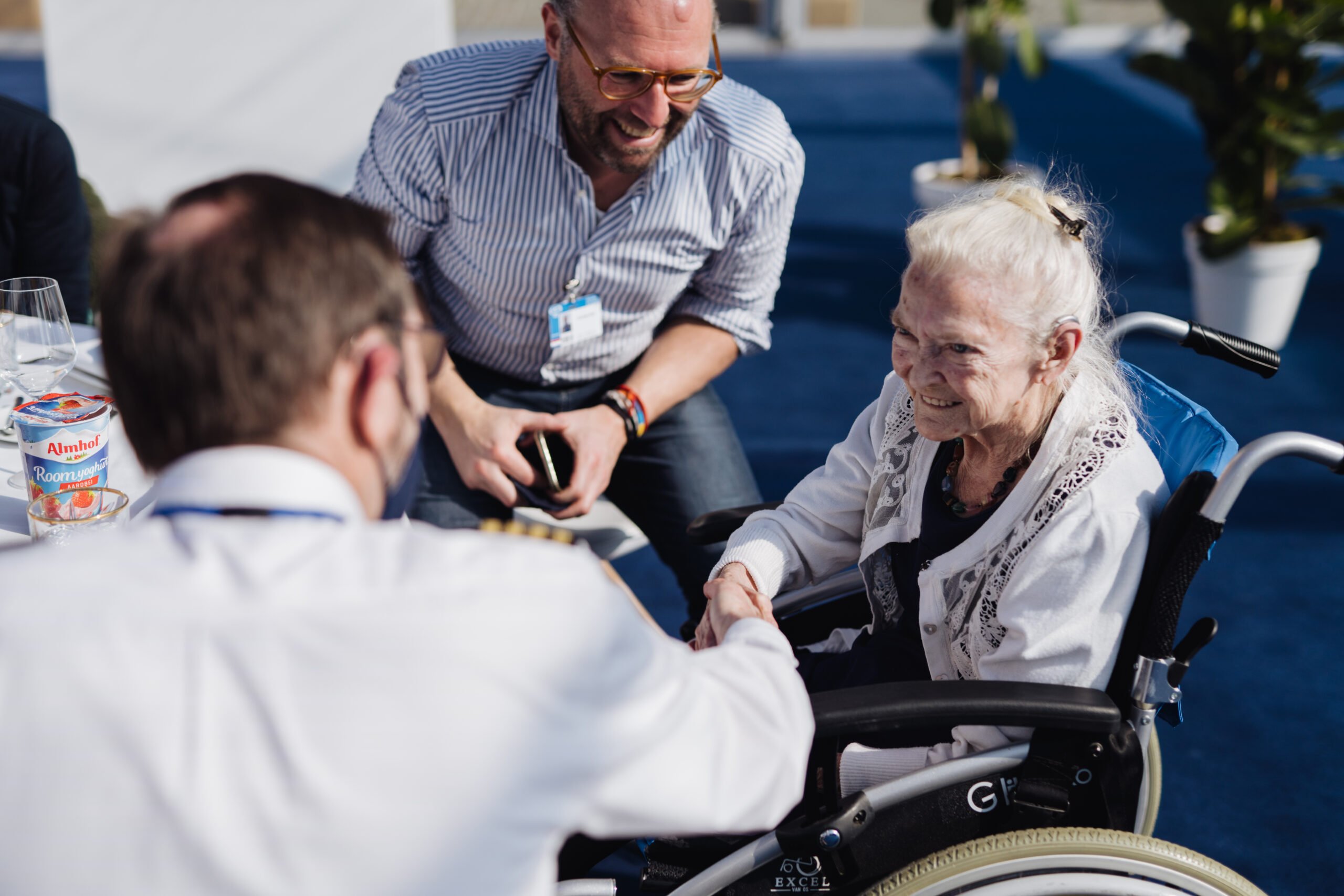 De hoogbejaarde dame, zelf schippersdochter en al jarenlang trouwe donateur van Mercy Ships, is er beduusd van. ‘Ik had nooit gedacht dat ik dit nog mee zou kunnen maken,’ zegt ze als haar rolstoel naast het schip wordt gerold. ‘Dit is een geweldige dag, dit maak je maar één keer in het leven mee.’