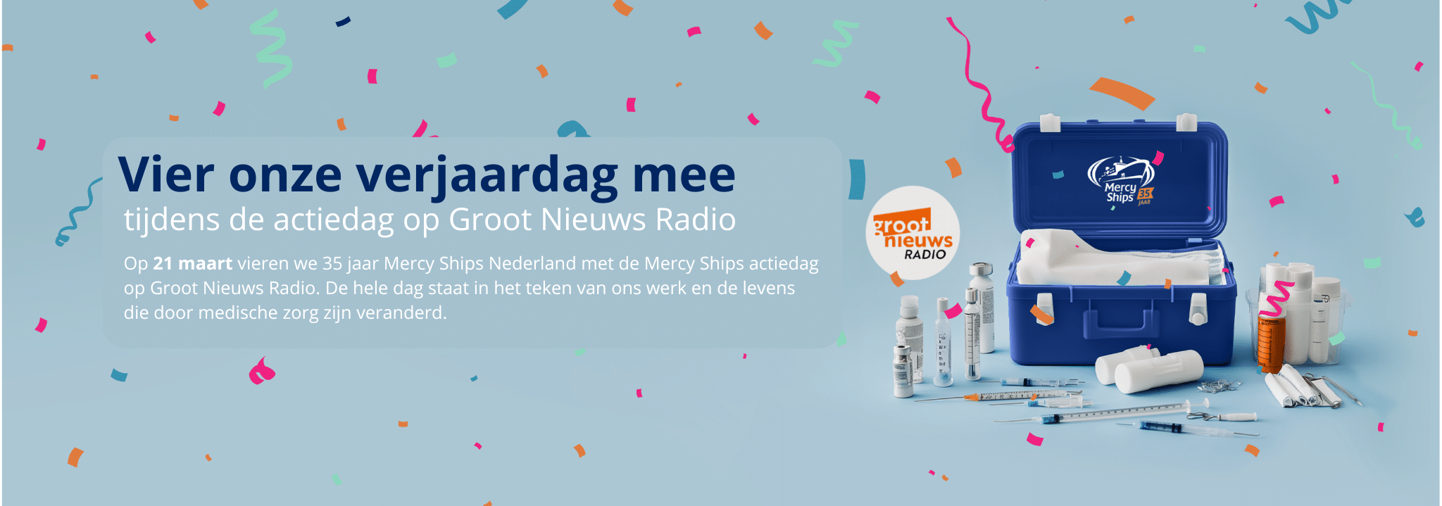 Feliciteer Mercy Ships Nederland met haar verjaardag! Doe een donatie voor ‘een medische set die een leven redt’ via www.mercyships.nl/actiedag en stem op vrijdag 21 maart af op Groot Nieuws Radio.