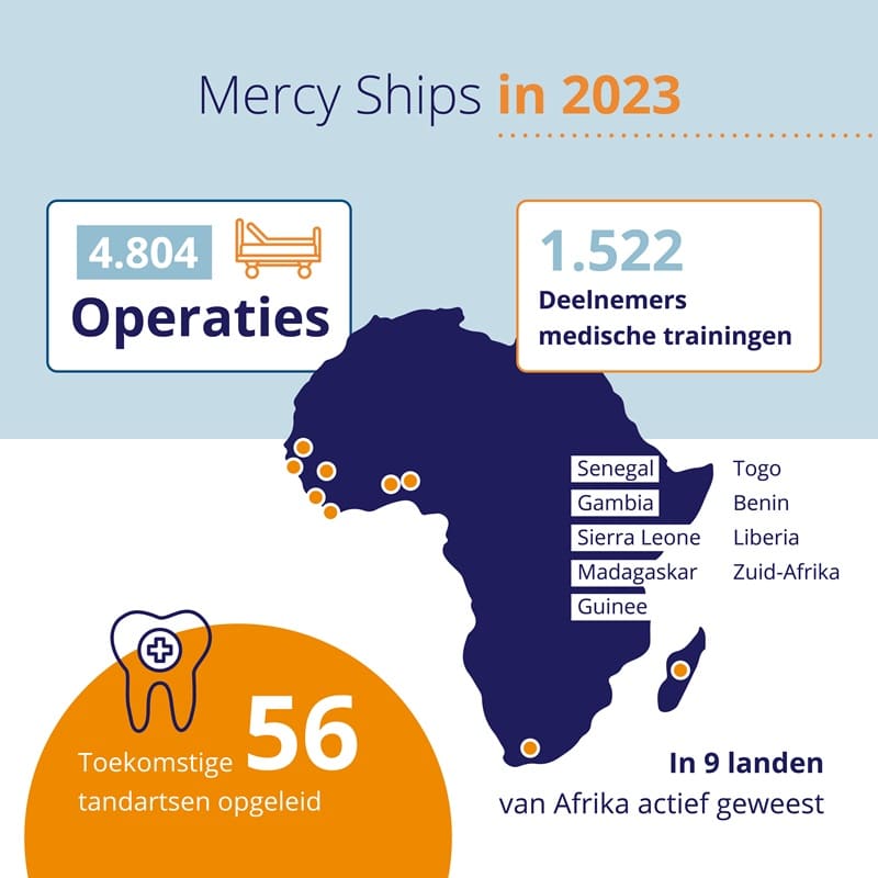 De ziekenhuisschepen van Mercy Ships waren in 2023 actief in Senegal, Gambia, Sierra Leone en Zuid-Afrika. De Africa Mercy werd in Zuid-Afrika gerenoveerd en verrichtte er medische trainingen, de Global Mercy was actief in de andere genoemde landen.
