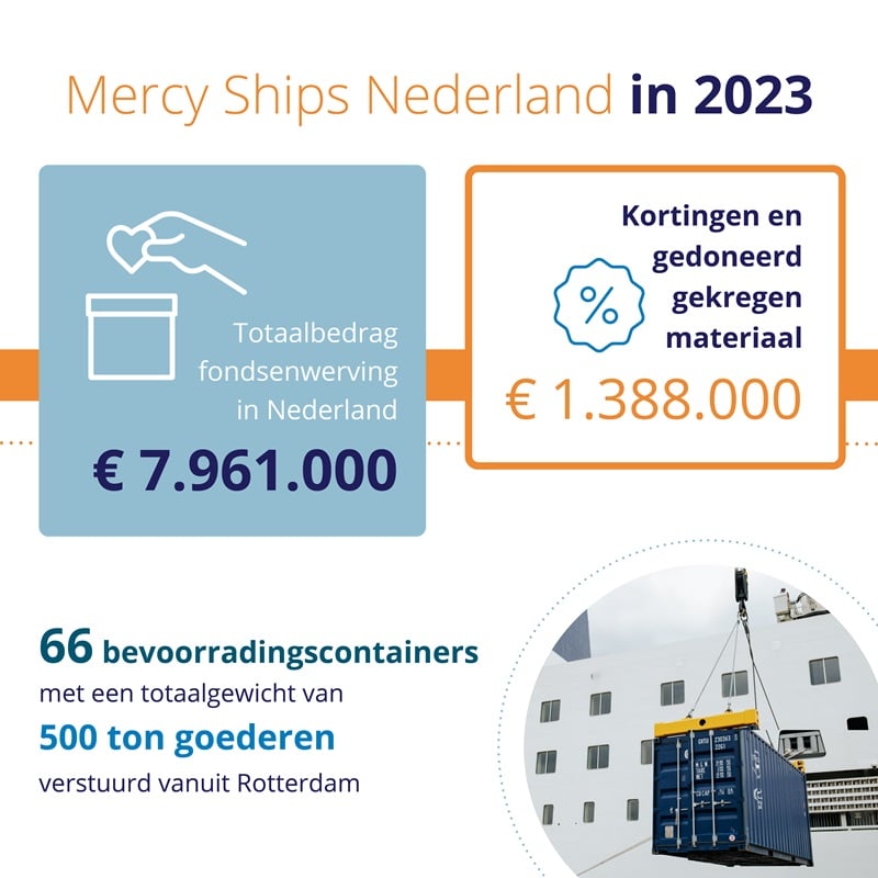 In 2023 werd er vanuit Rotterdam maar liefst 500 ton goederen naar de schepen en projecten van Mercy Ships verscheept. Het aantal door bedrijven en leveranciers gesponsorde materialen voor de schepen, de zogeheten gift in kind, nam opnieuw toe. Er werd in 2023 voor het bedrag van € 1.388.000 aan goederen gedoneerd.