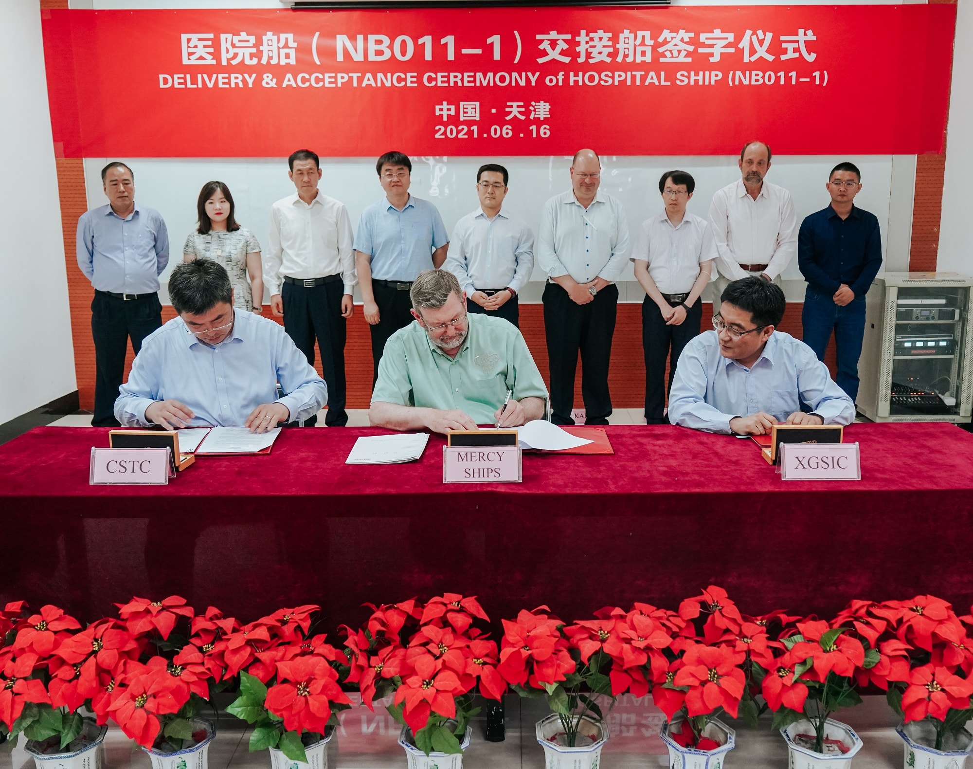 Jim Paterson (in het midden) ondertekent de overdrachtsdocumenten namens Mercy Ships