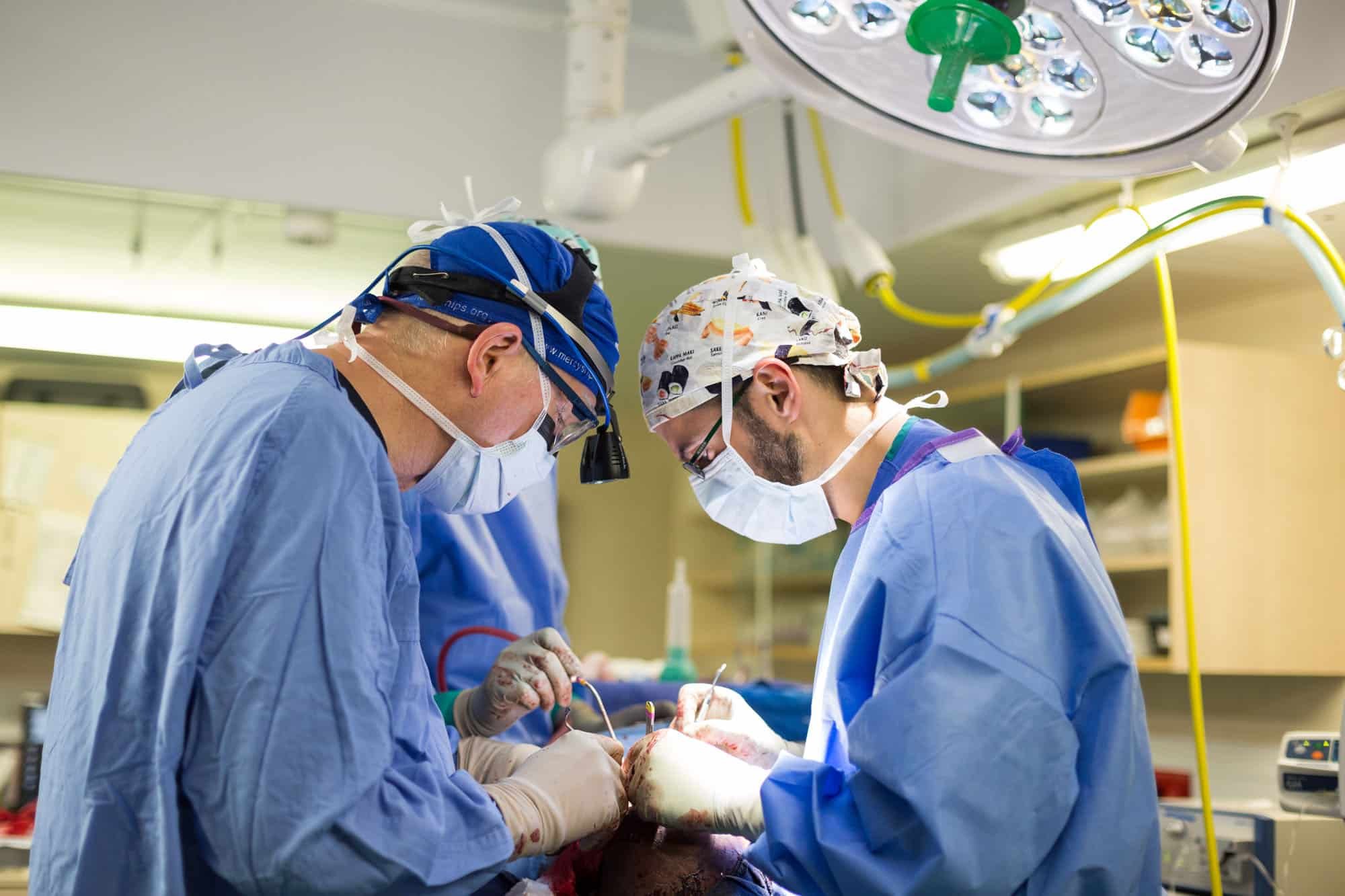Dr. Gary Parker en Dr. Mark Shrime voeren een operatie uit.