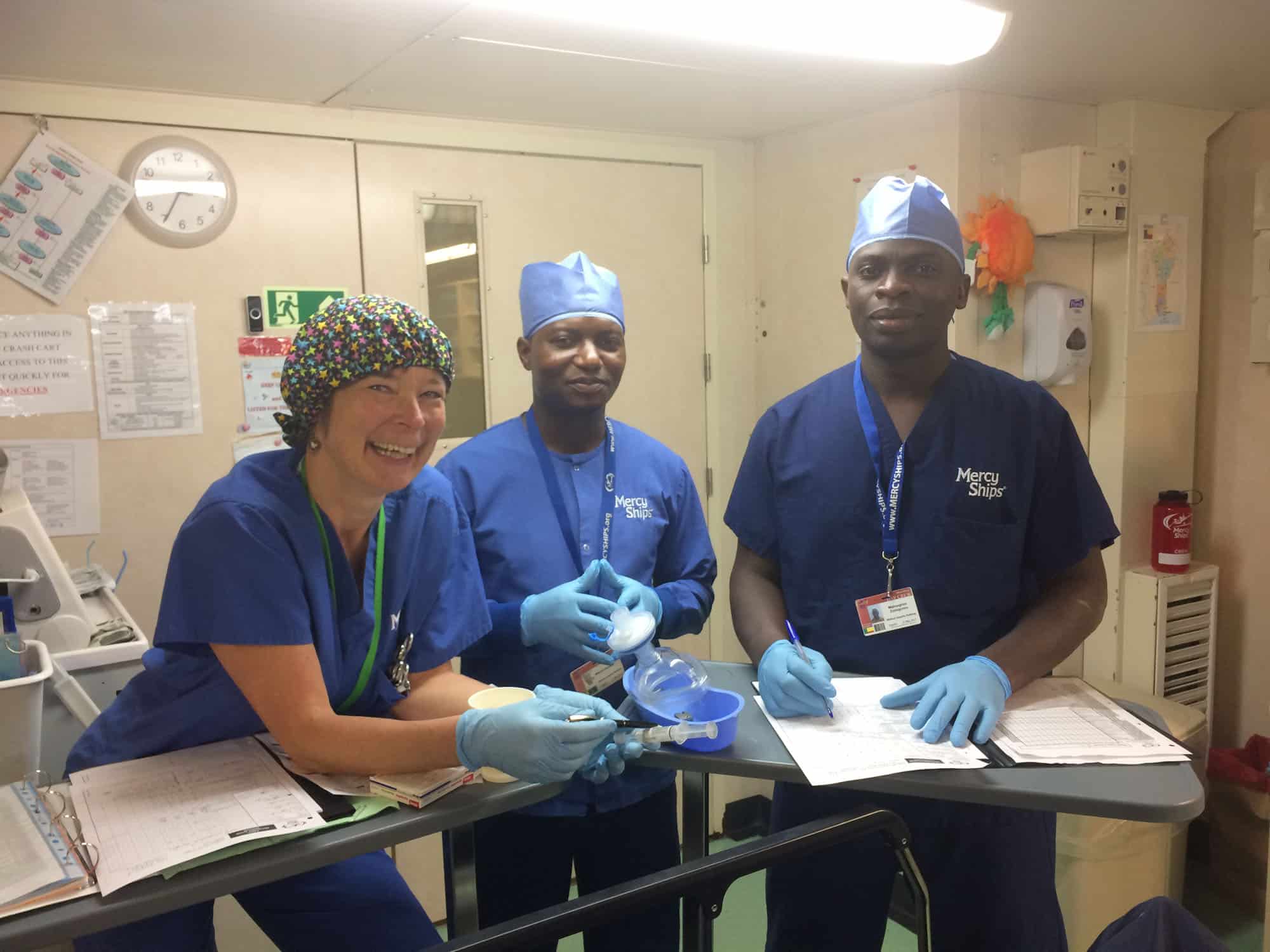 ‘Naast het geven van patiëntzorg begeleid ik soms ook lokale verpleegkundigen die op de PACU getraind worden. Hiervoor maak ik eerst een inschatting van de kennis die ze al in huis hebben. Daarna neem ik ze mee in de specifieke werkzaamheden op de uitslaapkamer: waar moeten ze specifiek op letten als patiënten uit narcose komen? Op het schip bewaken wij de vitale functies van patiënten met apparatuur. Maar lokale klinieken in Afrika hebben die apparatuur niet altijd voor handen, dus leer ik ze ook om gewoon de pols te voelen om de hartslag vast te stellen, bloeddruk met de hand te meten en te kijken naar de kwaliteit van de ademhaling. De meeste verpleegkundigen zijn erg leergierig, ik hoop altijd dat ze de opgedane kennis na de training meteen kunnen toepassen in hun eigen ziekenhuis.’