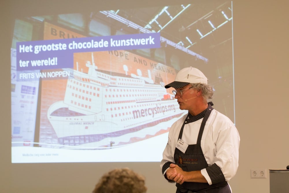 Na de minicursus vertelt Frits over het chocolade wereldrecord, dat tot stand kwam in samenwerking met Mercy Ships. Het record is inmiddels in de nieuwste druk van het Guinness World Record boek te bekijken. ‘Het wereldrecord zetten was een mega klus en een project van meer dan een jaar. Uiteindelijk zou ik het niet zo overdoen, maar de week van het record zetten zelf zou ik wel overdoen; die was zo ontzettend leuk. Het was een avontuur!’
