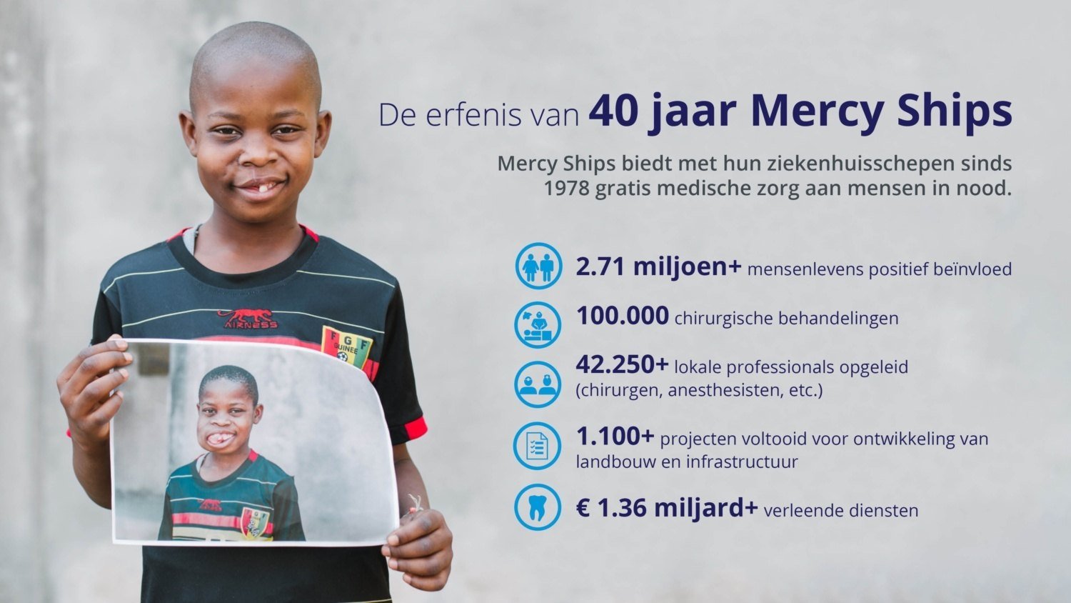 Mercy Ships begon met een droom: ziekenhuisschepen bemand met vrijwilligers die de armste landen van de wereld helpen door medische zorg te bieden. Gods liefde op een praktische manier aan de allerarmsten laten zien. Door de jaren heen heeft Mercy Ships met een handvol schepen meer dan twee miljoen mensen in ontwikkelingslanden geholpen met medische operaties en ontwikkelingsprojecten. En elke dag, met elke operatie, elke patiënt, brengen we die droom in vervulling.