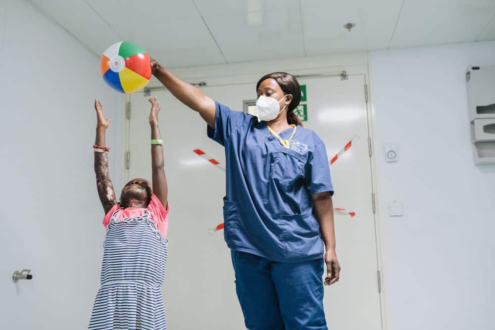 Zonder goede medische zorg zoals we die in Nederland kennen, was Satou’s herstel verre van optimaal. Ze kreeg last van weefsel dat zich samentrekt. Haar nek en borst groeiden uiteindelijk op een onnatuurlijke manier aan elkaar. Gewone dingen zoals spelen of iets dragen lukten steeds minder goed. ‘Ze moest voorzichtig zijn met rennen omdat ze haar nek niet kon bewegen en dan viel ze’, vertelt Satou’s moeder. Uiteindelijk trok Satou zich steeds verder terug en speelde ze helemaal niet meer. Want welk kind van 6 jaar wil er nou anders uitzien?