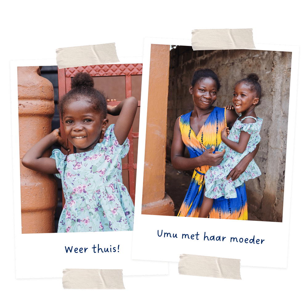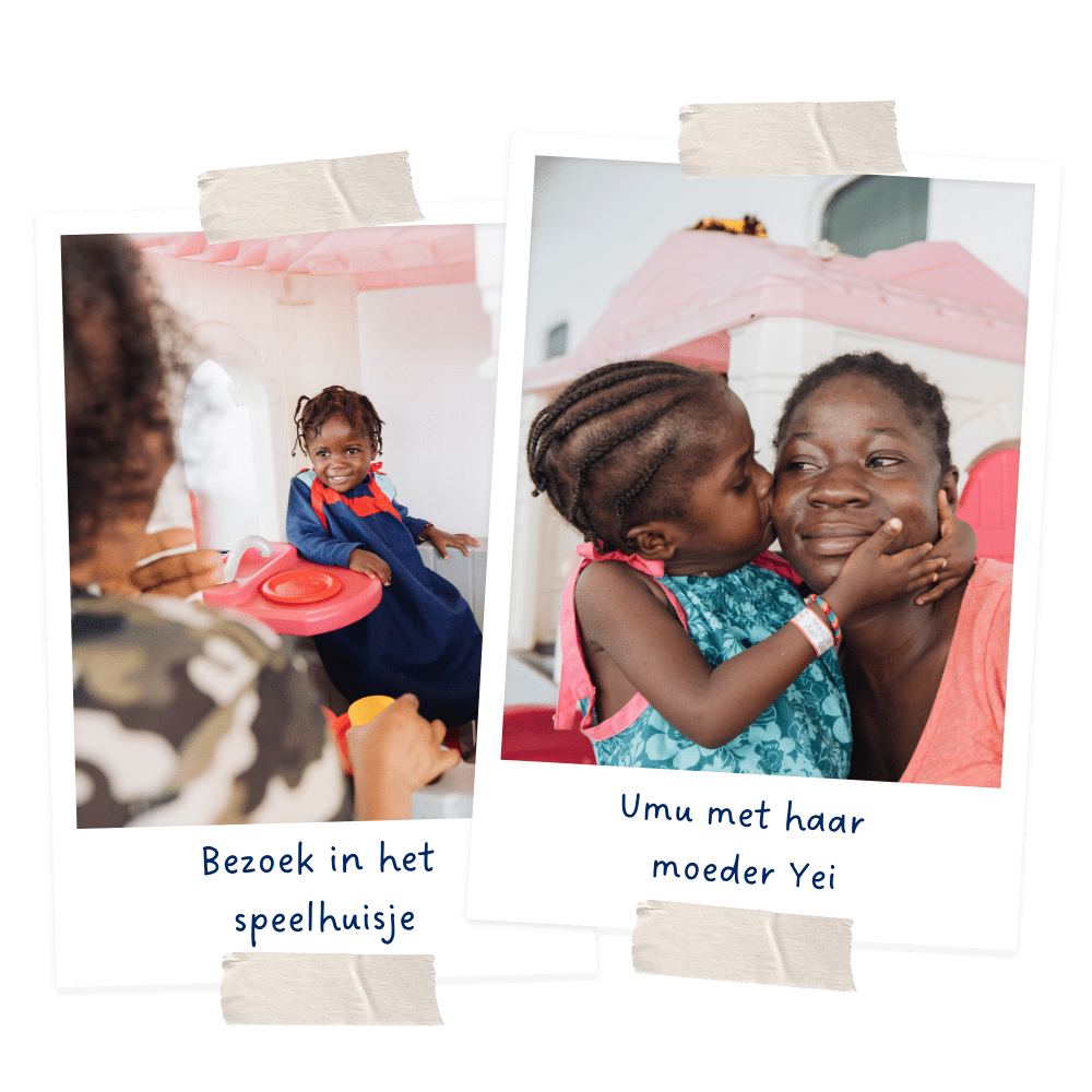 Yei is blij om haar dochter zo bezig te zien. Regelmatig zoekt Umu de aandacht van haar moeder en overlaadt ze haar met liefde en kusjes.