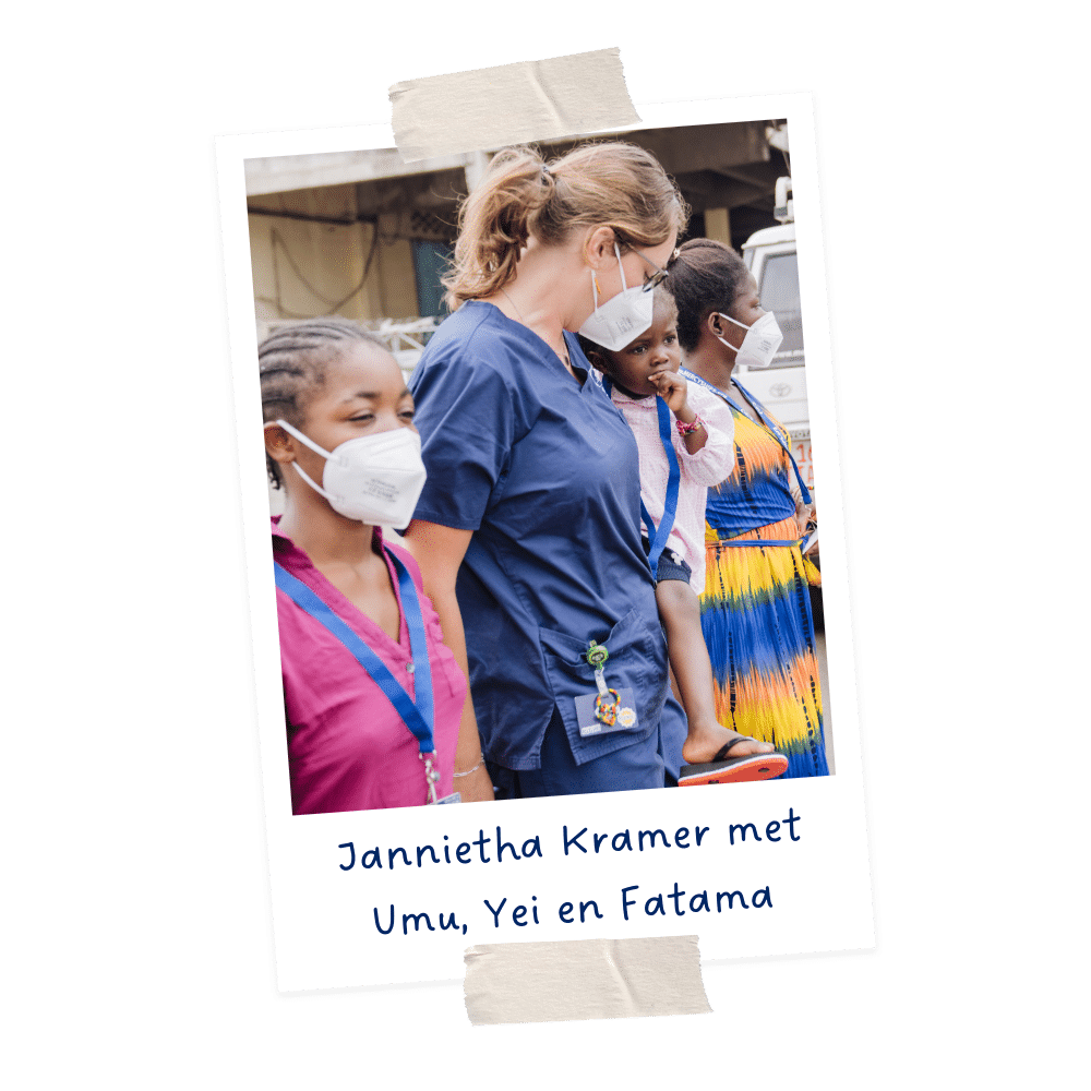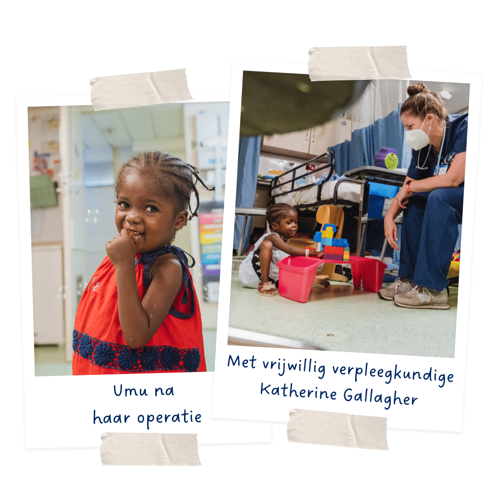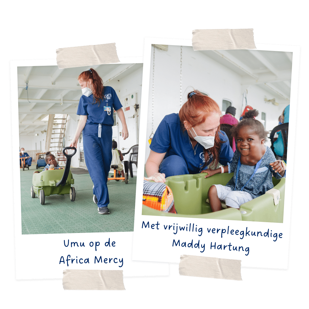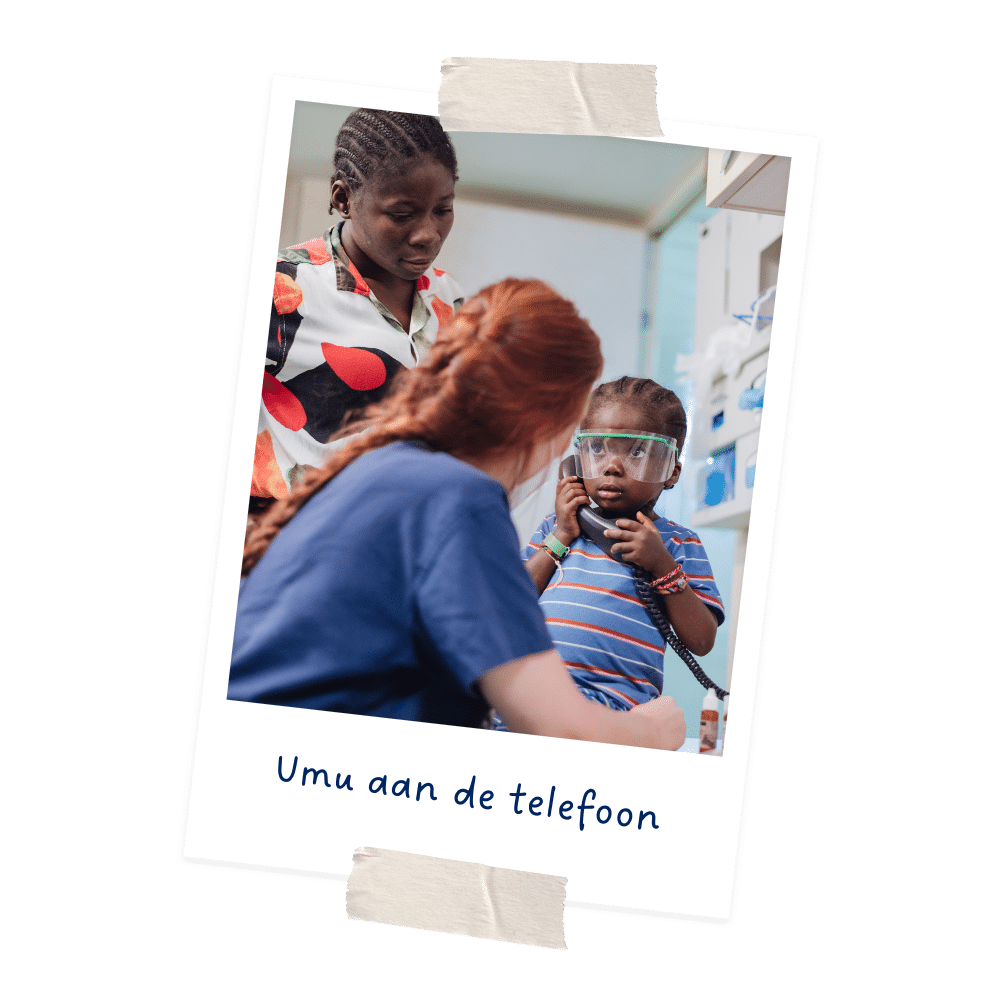 Jannietha, vrijwilliger verpleegkundige, vertelt: ‘Umu is een eigenwijs kleutertje. Ze weet precies wat ze wil. Iedereen op de afdeling kende haar, ze kwam vaak langs en was altijd overal. Zo kwam ze ook regelmatig de ziekenhuisafdeling op en wees ze naar de telefoon. Ze vond het geweldig om die uit te proberen. Het allerleukste was wanneer we belden naar de receptie van het schip. Dat is het mooie aan het leven als community aan boord, elke afdeling raakt betrokken in de missie. Iedereen had veel over Umu gehoord en voor haar gebeden, en als bewijs van de succesvolle operatie kregen ze nu een persoonlijk telefoontje van haar.’
