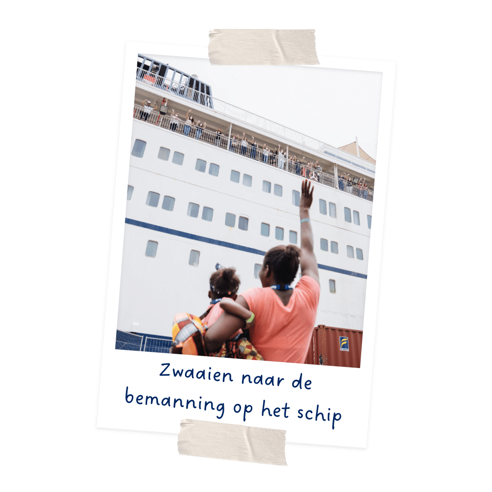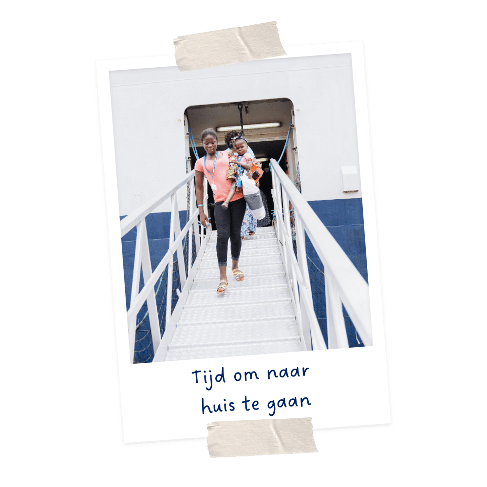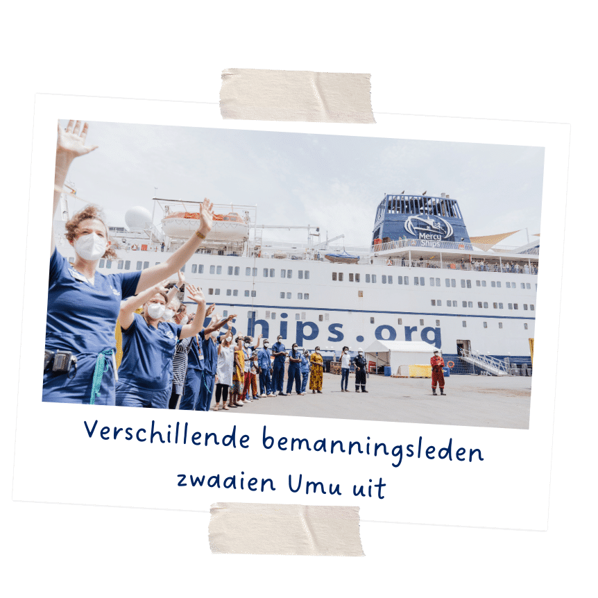 Op het dek en op de kade verzamelen vrijwilligers zich om het drietal uit te zwaaien. Veel van hen zijn met eigen ogen of via verhalen getuige geweest van Umu’s weg naar genezing. Er wordt geknuffeld, afscheid genomen en gezwaaid tot de auto het terrein heeft verlaten.