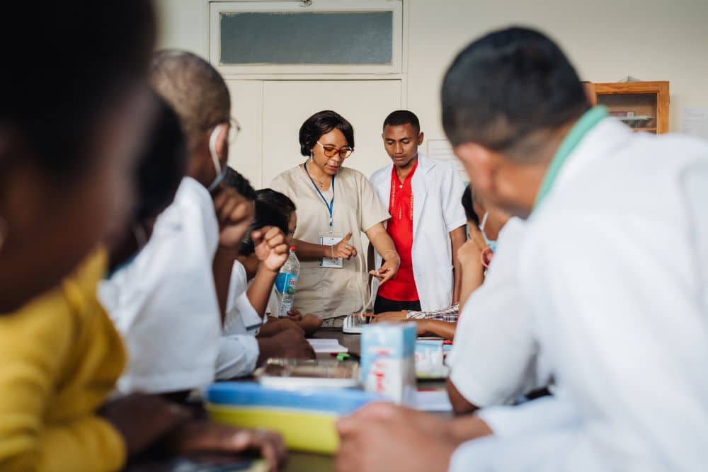 ‘Patiënten zullen er altijd zijn,’ zegt ze. ‘Ik ga op een gegeven moment met pensioen, of misschien word ik op een dag ziek, wie weet? Als we geen duurzame medische trainingen kunnen garanderen, zullen de opleidingsnormen nooit verbeteren.’ Aan het woord is professor Fanjandrainy Rasoaherinomejanahary – kort gezegd Fanja -, chirurg en professor in algemene chirurgie in Madagaskar. Het eiland aan de oostkant van Afrika waar het gerenoveerde ziekenhuisschip de Africa Mercy in februari aanmeerde. Al jaren traint Fanja studenten in chirurgische basisvaardigheden, nadat ze zelf in 2015 door Mercy Ships werd opgeleid tot trainer. Maar er is meer nodig, vindt ze. En dat is waarom een partnerschap met Mercy Ships zo belangrijk voor haar is.