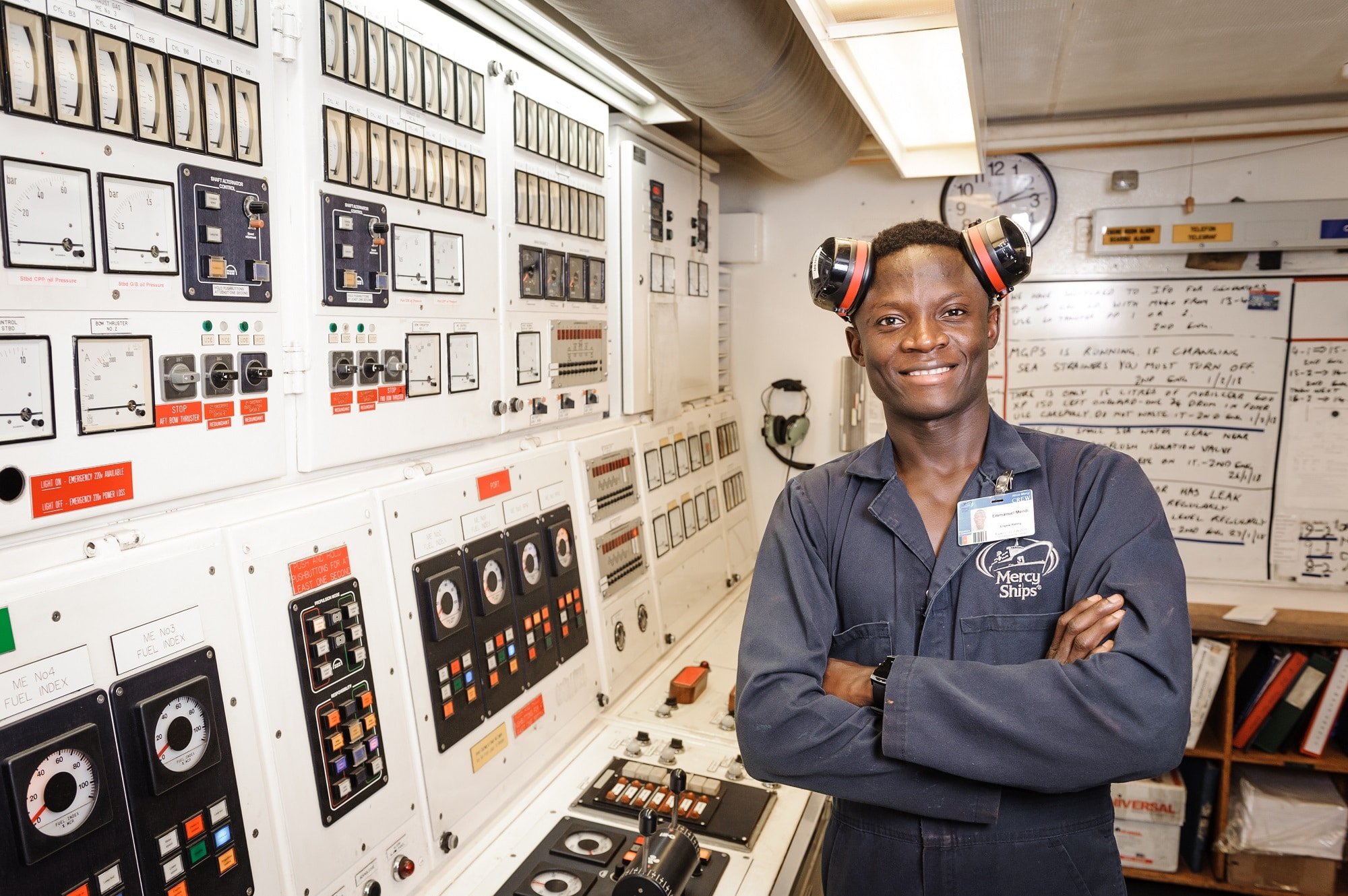 Maak bijvoorbeeld kennis met Emmanuel. Hij kwam voor het eerst aan boord van de Africa Mercy toen we in 2011 zijn geboorteland Sierra Leone bezochten. Emmanuel was toen een student boekhouding en kwam bij ons als assistent wachtmeester in de machinekamer. Twee jaar later besloot Emmanuel om fulltime in dienst te gaan en met het schip mee te gaan naar de volgende havens die we aandeden. Sindsdien is hij nooit meer weg gegaan! Momenteel werkt hij als vierde machinist.