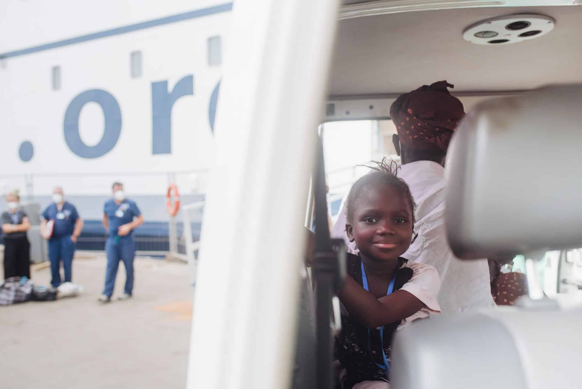 De genezing kwam twee jaar later, toen Ibrahima hoorde over Mercy Ships en de gratis operaties die ze aanboden voor aandoeningen als die van Sira. ‘Onze buurman was er al geweest en zijn kind was volledig genezen.’ Sira onderging een screening en werd geselecteerd voor een operatie. Haar ouders konden zelf niet met haar meereizen naar Dakar, waar het ziekenhuisschip aanmeerde. Ibrahima moest zijn gewassen planten en Binti moest voor Sira’s broers en zussen zorgen. Dus reisde Sira, samen met haar grootmoeder Diaite, meer dan 12 uur vanuit hun dorp, Simbadi Balante in Zuid-Senegal, om aan boord te gaan van de Africa Mercy.