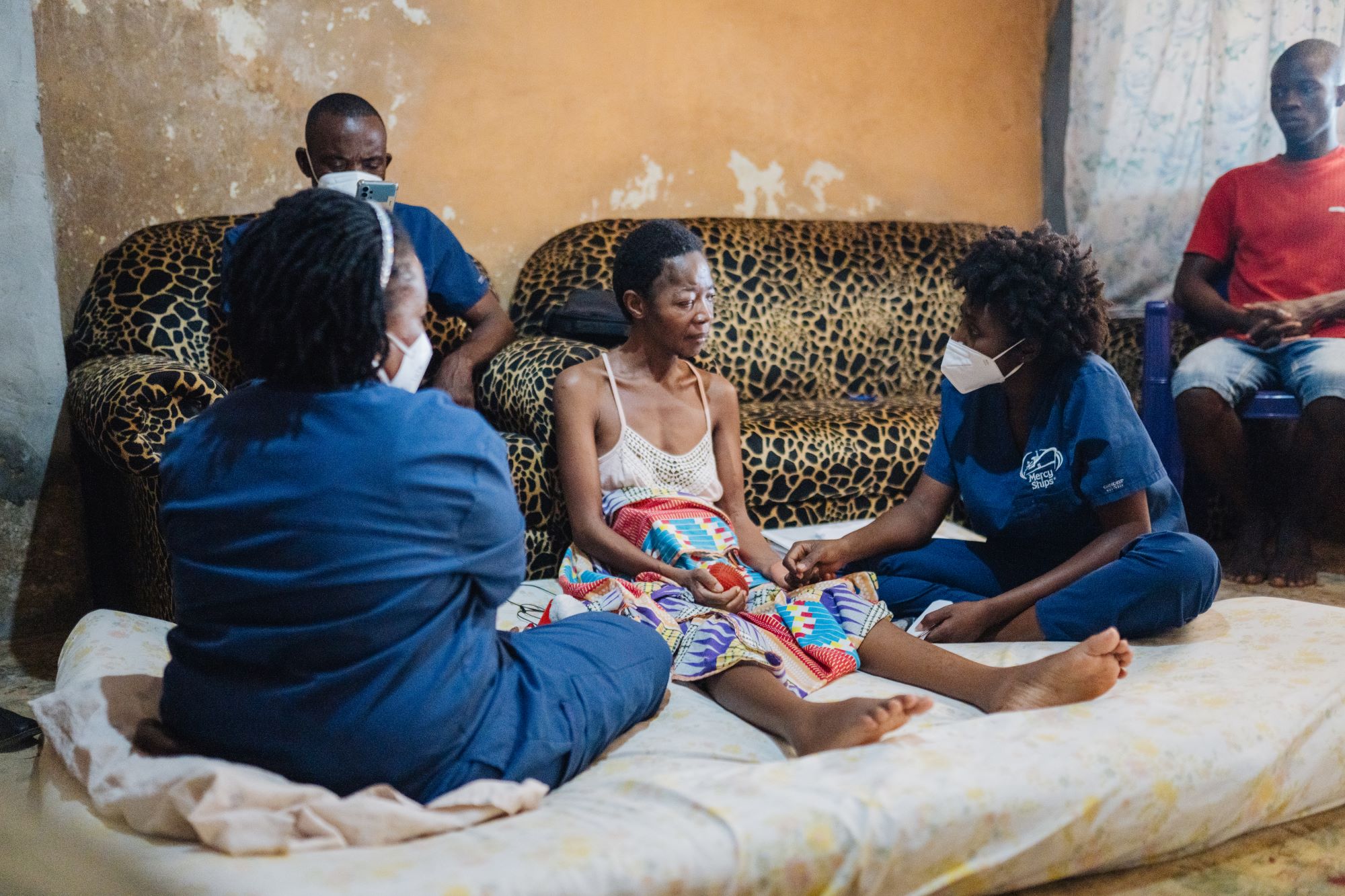 ‘Als palliatief verpleegkundige proberen we geen dagen aan hun leven toe te voegen, maar leven in hun dagen,’ legt vrijwillig verpleegkundige Willianne Kramer uit. Gespecialiseerde palliatief verpleegkundigen, zoals Willianne, verlaten elke ochtend het drijvende ziekenhuis van Mercy Ships om deze patiënten thuis te bezoeken. Hun missie is om holistische zorg te bieden door aandacht te besteden aan zowel hun fysieke als emotionele behoeften. ‘Het gaat om het geven van totale zorg aan de patiënten. Dus we kijken niet alleen naar het fysieke deel, maar we kijken ook naar het mentale deel, het spirituele deel, de familie, het sociale deel, de gemeenschap – hoe het met ze gaat,’ vervolgt Willianne.