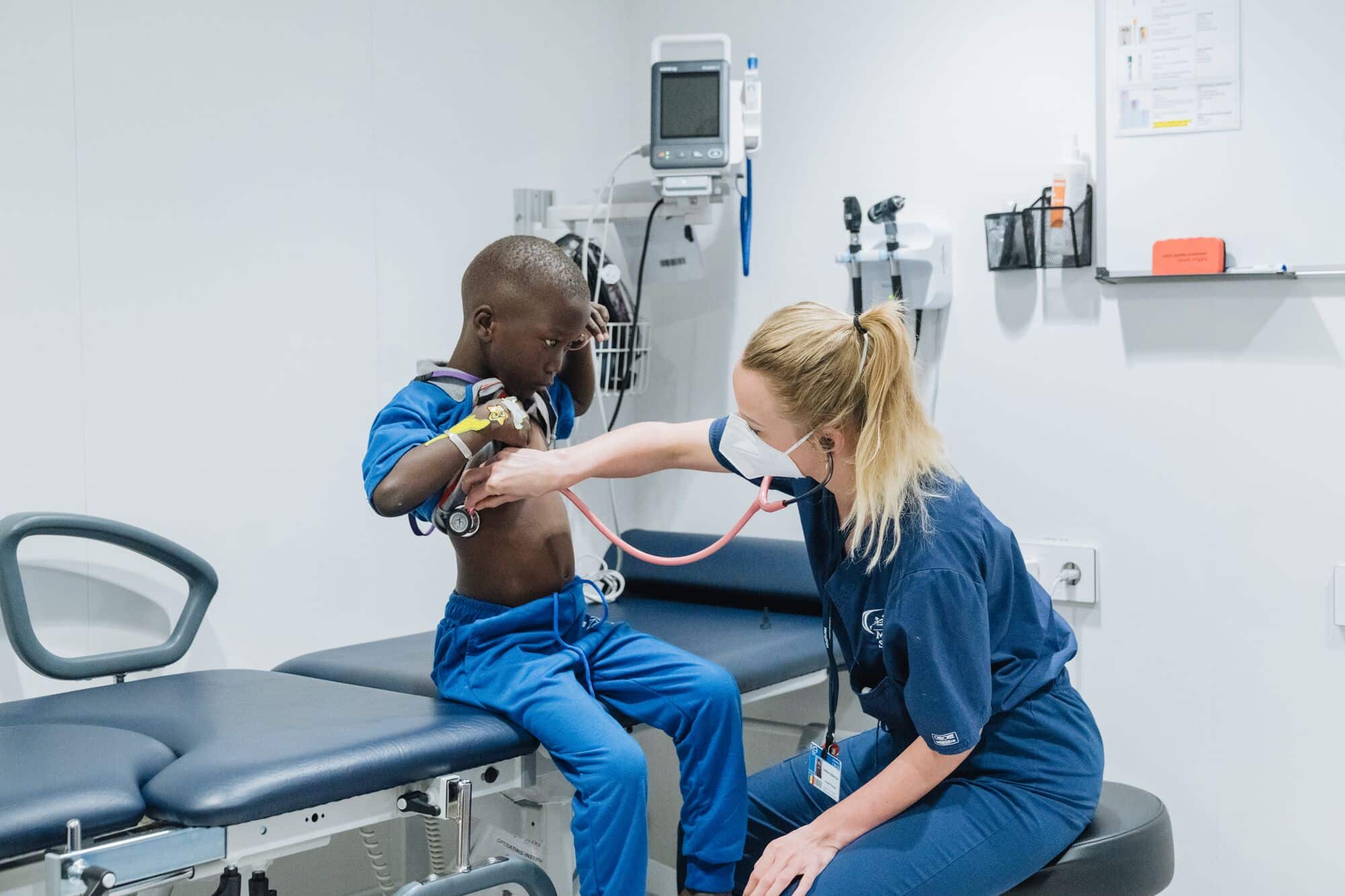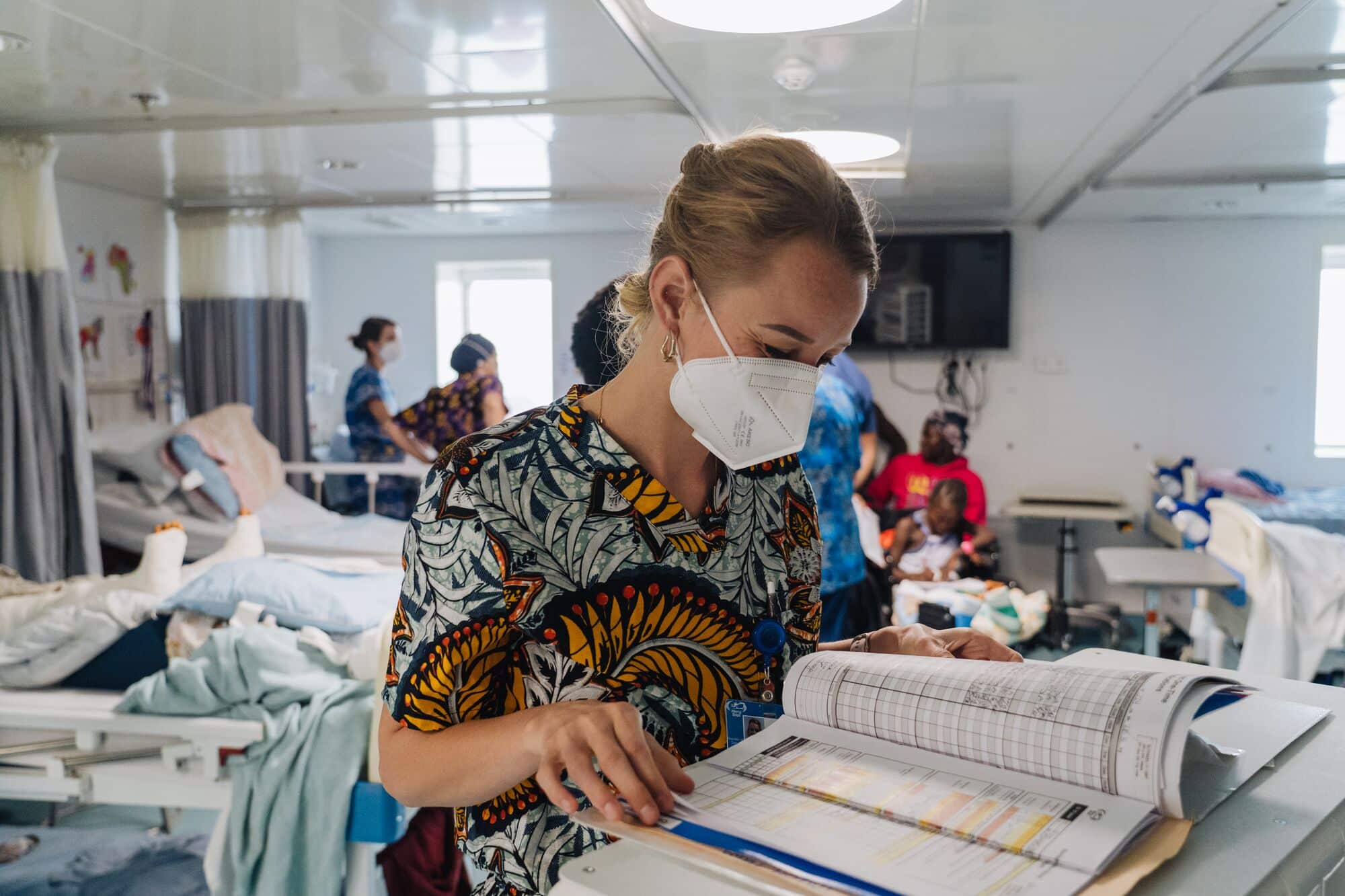 Ik werk ook als zaalarts op de Global Mercy. Elke ochtend begint mijn dag op de ziekenzaal met de “visite”. Dit doe ik samen met de behandelend chirurg. De chirurg kijkt naar de wondgenezing en ik kijk naar het algemene gezondheidsbeeld van de patiënt. Regelmatig komt het voor dat de patiënt na de operatie koorts krijgt. Meestal is dit een normale reactie van het lichaam op de narcose, maar het is goed om complicaties uit te sluiten. Ik onderzoek de patiënt om te zien of er sprake is van bijvoorbeeld een infectie of longembolie. Ik behandel hen en help hen weer zo gezond mogelijk naar huis te gaan; klaar voor een nieuw leven!